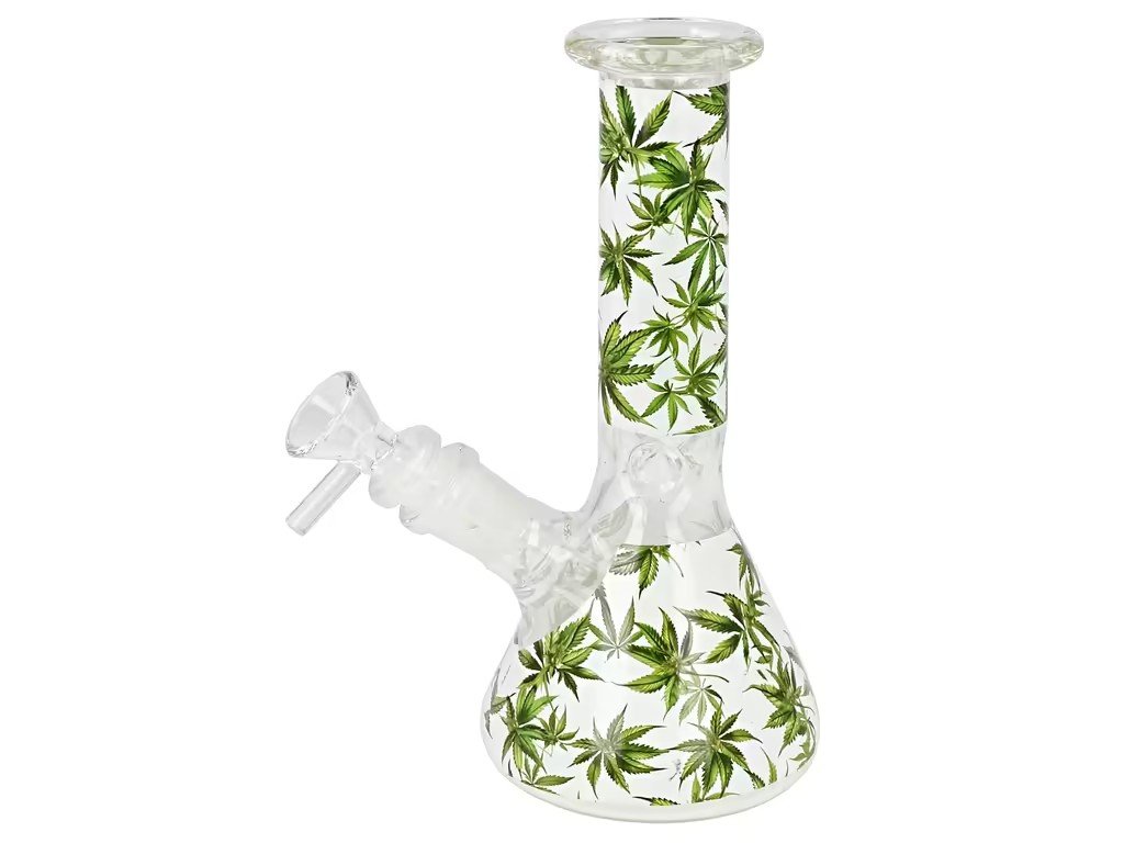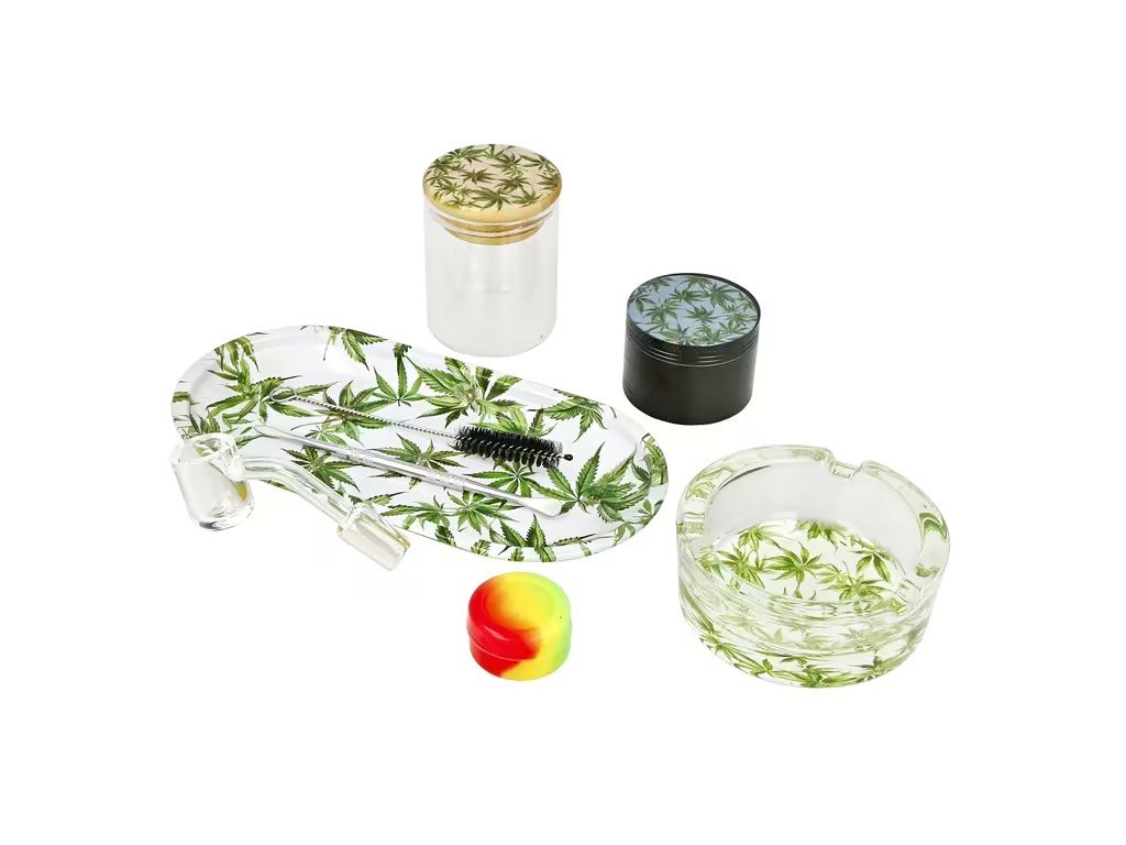 Dárková sada - skleněný bong zdobený konopnými listy v setu s kuřáckými potřebami. Dárkový set obsahuje ice bong s klasickým a olejovým kotlíkem, popelník, kovový tácek, schovku na byliny v pevném stavu a také na tekuté extrakty, čtyřdílnou drtičku, dabber na extrakty a čisticí kartáček. Díky přiloženému olejovému kotlíku je možné z toho bongu udělat olejový bong a kouřit z něho nejen byliny v pevném stavu, ale také veškeré tekuté bylinné extrakty (wax, olej apod.) Vše je dodávané v dárkovém boxu. Parametry bongu:; Výška: 21 cm; Vnitřní průměr bongu: 2,5 cm; Vnější průměr bongu: 3,2 cm; Průměr hrdla: 4,8 cm; Tloušťka skla: 3,5 mm; Socket (zábrus) chillumu/kotlíku: 18,8 mm / 14,5 mm; Max. délka chillumu (měřeno od dosedací kónické části): 9,5 cm; Led: ano; Perkolace: ne; Turbo: ne; Sítko do bongu: 12 mm; Barva bongu: bílá; Materiál: borosilikátové sklo; ; Rozměry:; Drtička: 4,8 x 3,6 cmDoplňkové parametry