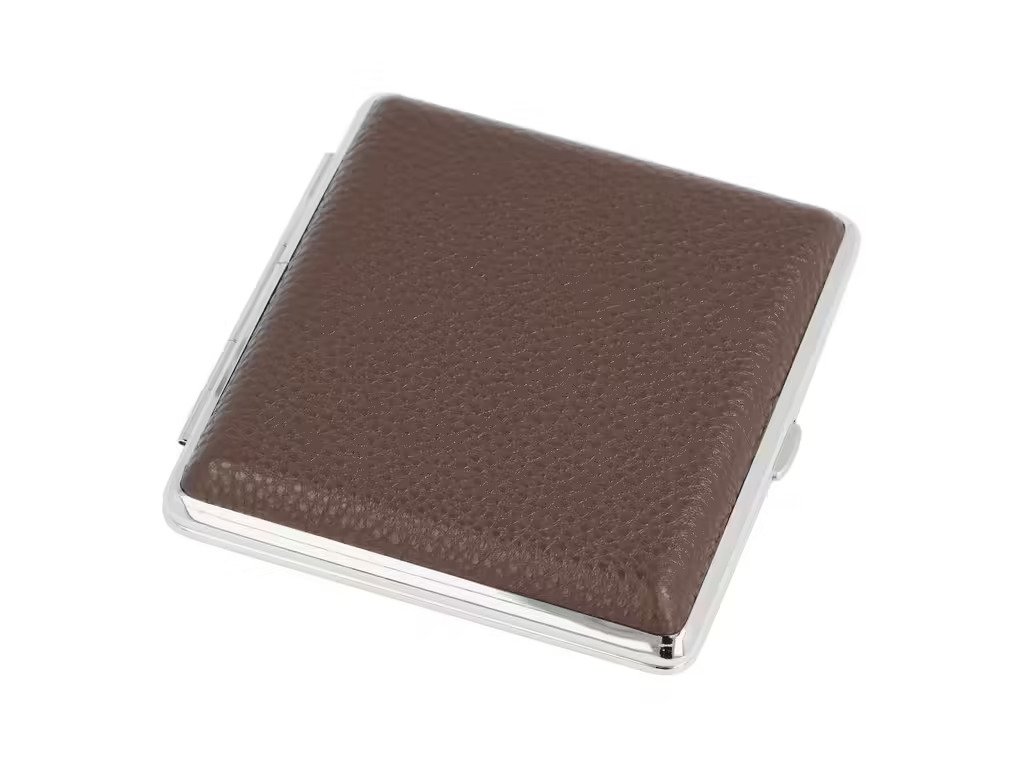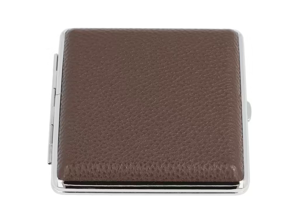 Kožená tabatěrka na 20 ks cigaret klasické velikosti (King Size). Kovové cigaretové pouzdro Angelo má jemně texturovaný povrch ve tmavě hnědém matném provedení. Přední a zadní strana pouzdra jsou stejné. Cigarety jsou uvnitř tabatěrky zajištěny gumičkou. Cigaretové pouzdro je dodávané v papírové krabičce. Vnitřní rozměry pouzdra (Š x V): 7,8 x 8,5 cm. Materiál: kov/kůže.Doplňkové parametry