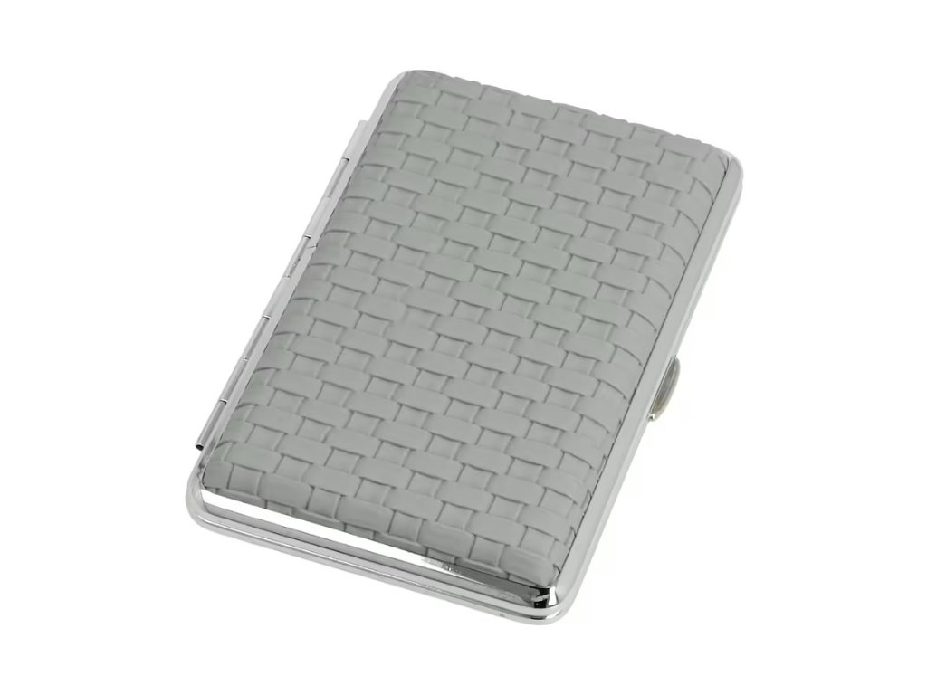Koženková tabatěrka na dlouhé stovkové cigarety pojme 16 ks cigaret běžného průměru (King Size). Matný povrch pouzdra s hrubší texturou je v šedé barvě. Cigaretové pouzdro má přední a zadní stranu stejnou. Cigarety jsou zajištěny gumičkou. Tabatěrku dodáváme v papírové krabičce.; Vnitřní rozměry pouzdra (Š x V): 5,7 x 9,6 cm (jedna strana); Materiál: kov/koženkaDoplňkové parametry