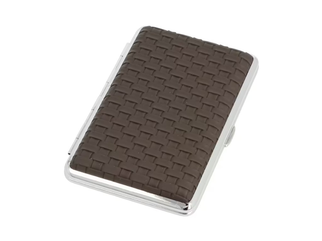 Koženková tabatěrka na dlouhé stovkové cigarety pojme 16 ks cigaret běžného průměru (King Size). Matný povrch pouzdra s hrubší texturou je ve tmavě hnědé barvě. Cigaretové pouzdro má přední a zadní stranu stejnou. Cigarety jsou zajištěny gumičkou. Tabatěrku dodáváme v papírové krabičce.; Vnitřní rozměry pouzdra (Š x V): 5,7 x 9,6 cm (jedna strana); Materiál: kov/koženkaDoplňkové parametry