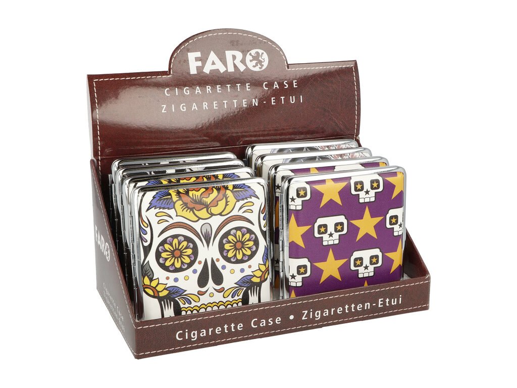 Koženková tabatěrka na 20 ks cigaret klasické velikosti (King Size). Atraktivní cigaretové pouzdro Skull je v pestrém barevném provedení kombinované s lesklým chromem. Přední strana pouzdra je potištěná motivem lebky, zadní strana je jednobarevná. Cigarety jsou uvnitř tabatěrky zajištěny gumičkou. Cena je uvedena za 1 ks. Před odesláním objednávky uveďte číslo barevného provedení do poznámky.Vnitřní rozměry pouzdra: 8x8,8 cm
