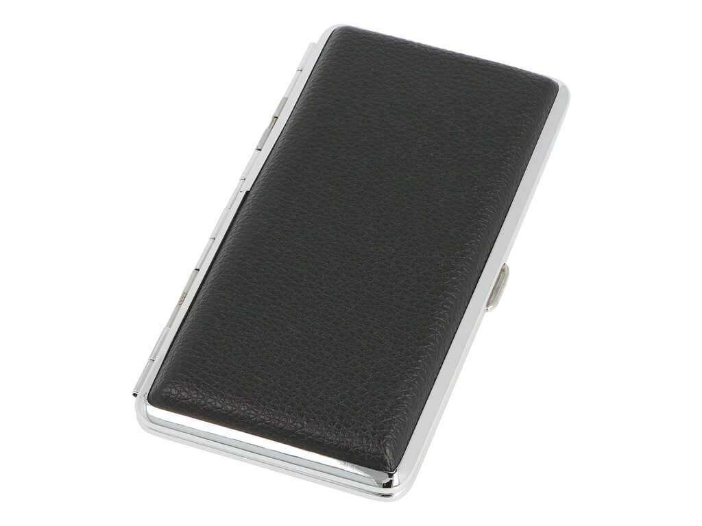 Koženková tabatěrka na dlouhé stovkové cigarety, 12 ks cigaret běžného průměru (King Size). Povrch pouzdra Black je v černém polomatném provedení s jemnou texturou v kombinaci s chromovým kovovým rámečkem. Cigaretové pouzdro má přední a zadní stranu stejnou. Cigarety jsou zajištěny plíškem s pružinkou. Tabatěrku dodáváme v papírové krabičce.Vnitřní rozměry pouzdra (Š x V): 5,6 x 11,7 cm