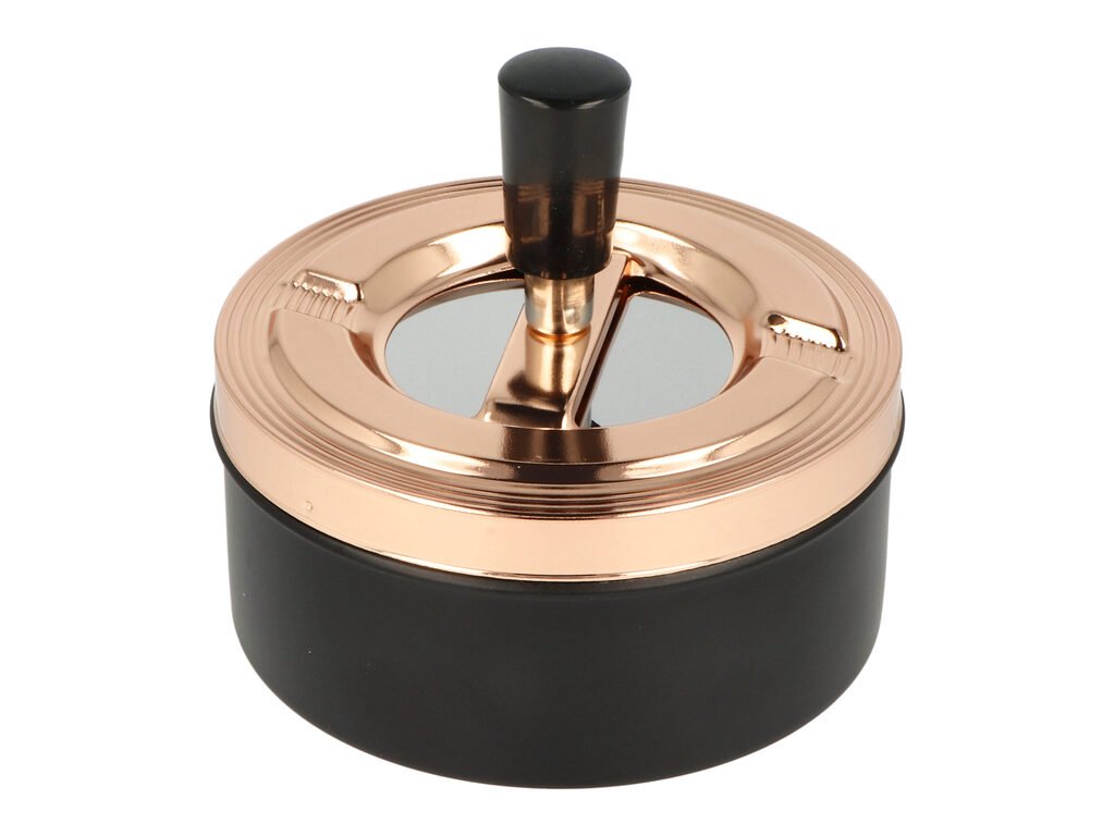 Venkovní cigaretový popelník otočný matný. Samozhášecí kovový popelník na cigarety nejen pro venkovní použití je v černém matném odstínu kombinovaný s lesklým víkem v měděném provedení.Průměr popelníku: 11 cm