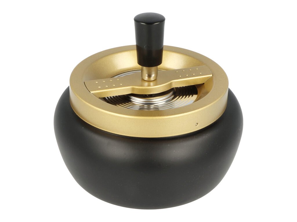 Venkovní cigaretový popelník otočný zlatý. Samozhášecí kovový popelník na cigarety nejen pro venkovní použití je v černo zlaté barevné kombinaci v matném provedení.Průměr popelníku: 13 cm