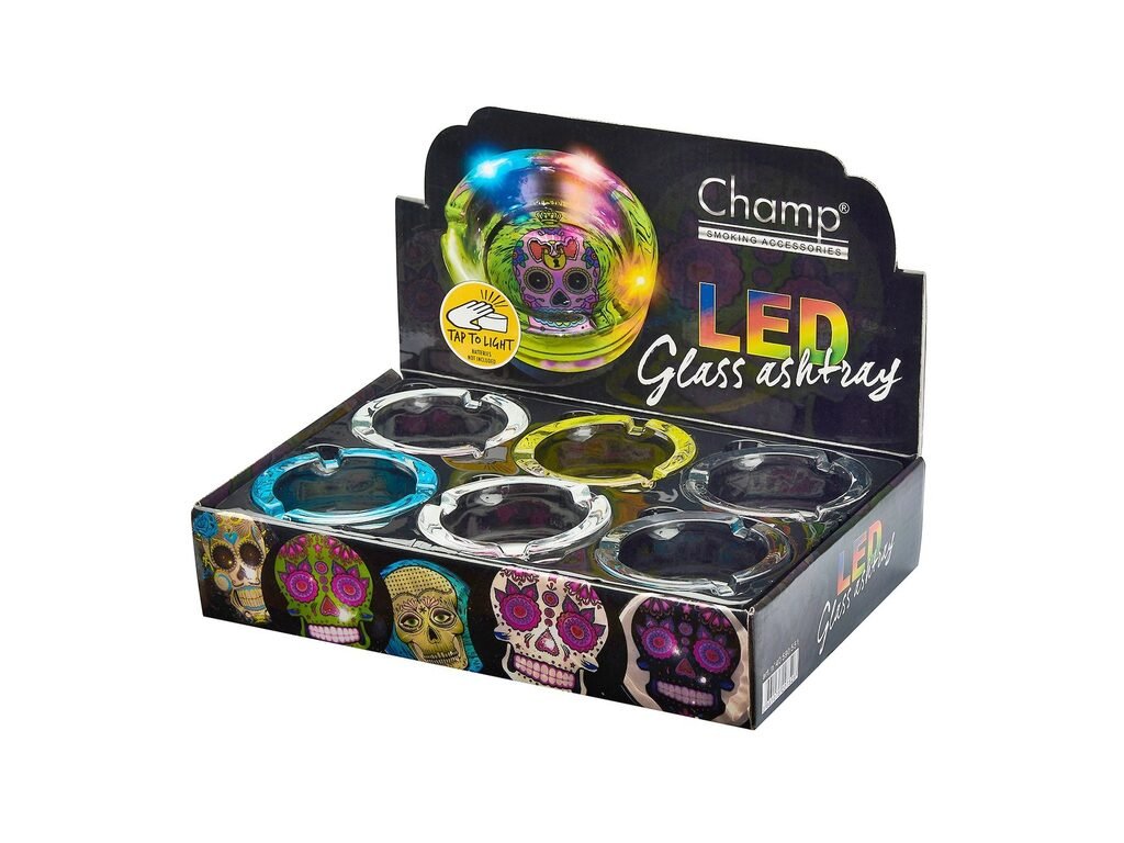 Cigaretový skleněný popelník Skull s LED osvětlením. Kulatý blikající popelník na tři cigarety je na dně zdobený barevným motivem lebky. Skleněný popelník se barevně rozbliká při doteku na jeho povrchu či při manipulaci s ním. K vypnutí blikání diod dojde samovolně cca. za 10 vteřin. Menší cigaretový popelník je vyrobený ze skla tloušťky 9mm. LED osvětlení popelníku spolu s prostorem pro baterie je umístěné pod dnem popelníku. Napájení zajišťují 3x AAA baterie 1,5V, které nejsou součástí dodávky. Rozměry popelníku: 8,5x8,5x5,3cm. Cena je uvedena za 1 ks. Před odesláním objednávky uveďte číslo barevného provedení do poznámky.Distributor: Fortis-DB, spol. s r.o.