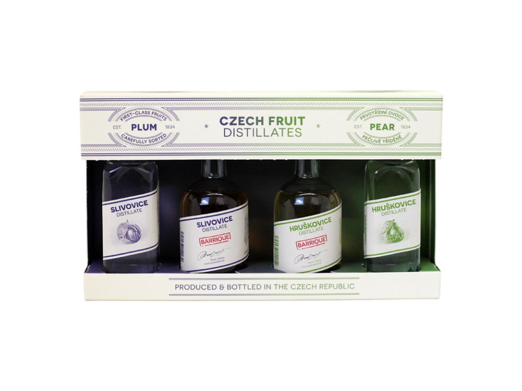 4 x 0,05 l Přesně to, co očekává milovník destilátů!; Dárková sada obsahuje:1x Slivovicový destilát, nejméně 2 roky starý. Alc. 50% vol.1x Hruškový destilát z odrůdy Williams. Alc. 50% vol, 1x Slivovicový destilát stařený několik let v dubovém sudu. Alc. 43% vol. 1x Unikátní hruškový destilát stařený v dubovém sudu. Alc. 43% vol.Doplňkové parametry