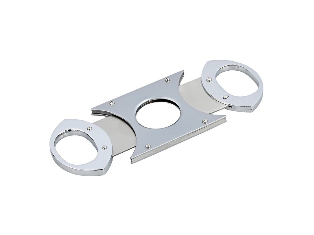 Dvoubřitý doutníkový ořezávač Angelo. Celokovový ořezávač na doutníky s povrchem kombinující stříbrné tělo a ostatní části v lesklém chromu zdobený kovovými "nýty". Ostré břity zajistí rychlý a čistý ořez vašeho doutníku. Ořezávač je dodávaný v dárkové krabičce. Délka 8,7cm.Max. průměr otvoru pro doutník: 20 mm