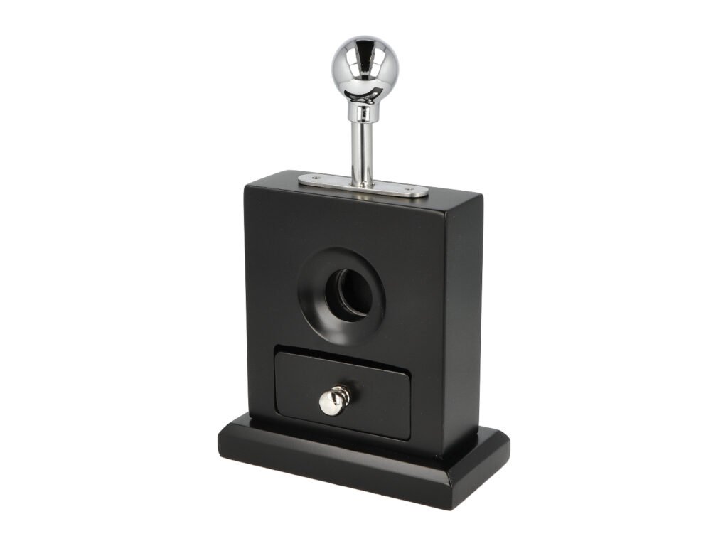 Stolní jednobřitý doutníkový ořezávač Angelo. Praktická gilotina na doutníky se zásuvkou si najde místo u nejednoho kuřáka doutníků. Hladký dřevěný povrch ořezávače je v černém polomatném provedení, kovové madlo šuplíčku a páka břitu jsou v lesklé chromové úpravě. Doutník jednoduše vložíte do připraveného otvoru a stisknete páku dolů. Ostrý břit rychle a čistě ořízne požadovanou stranu doutníku. Nepořádek z ořezání skryjete do vytažené zásuvky a nyní si jen stačí doutník zapálit a vychutnávat si jeho chuť. Proti poškrábání povrchu na kterém gilotina stojí, je spodní část vybavená jemným filcem. Ořezávač je dodávaný v kartonové krabici.Max. průměr otvoru pro doutník: 19 mm