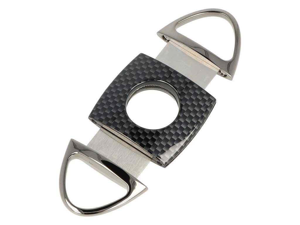 Dvoubřitý ořezávač Angelo Carbon. Elegantní kovový ořezávač na doutníky oválného tvaru v lesklé kombinaci imitace karbonu a gunmetalového provedení. Ostré břity vyrobené z kvalitní oceli zajistí rychlý a čistý ořez vašeho doutníku. Doutníkový ořezávač je dodávaný v dárkové krabičce.Max. průměr otvoru pro doutník: 22 mm