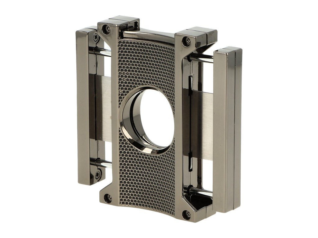 Dvoubřitý doutníkový ořezávač Angelo Colossus. Masivnější kovový ořezávač na doutníky má povrch v lesklém gunmetalovém provedení. Na přední i zadní straně je zdobený atraktivní perforovanou mřížkou. Po stisknutí tlačítka na horní straně se břity rozjedou od sebe a ořezávač je připravený k použití. Ostré břity vyrobené z kvalitní oceli zajistí rychlý a čistý ořez vašeho doutníku. Ořezávač na doutníky lze postavit na stůl jako vkusný doplněk Vašeho interiéru. Doutníkový ořezávač je dodávaný v dárkové krabičce.Max. průměr otvoru pro doutník: 24 mm
