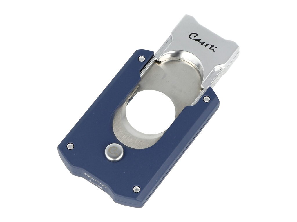 Kovový doutníkový ořezávač Caseti Shape Blue. Kvalitně zpracovaný dvoubřitý ořezávač na doutníky typu gilotina má matný povrch v modré barvě. Po stisknutí pojistky na přední straně směrem dolů se horní břit rozevře a ořezávač je připravený k použití. Ostré břity vyrobené z kvalitní nerezové oceli garantují rychlý a čistý ořez doutníku. Doutníkový ořezávač je dodávaný v dárkové krabičce. Ořezávače Caseti jsou navrhované ve Francii.Max. průměr otvoru pro doutník: 21 mm
