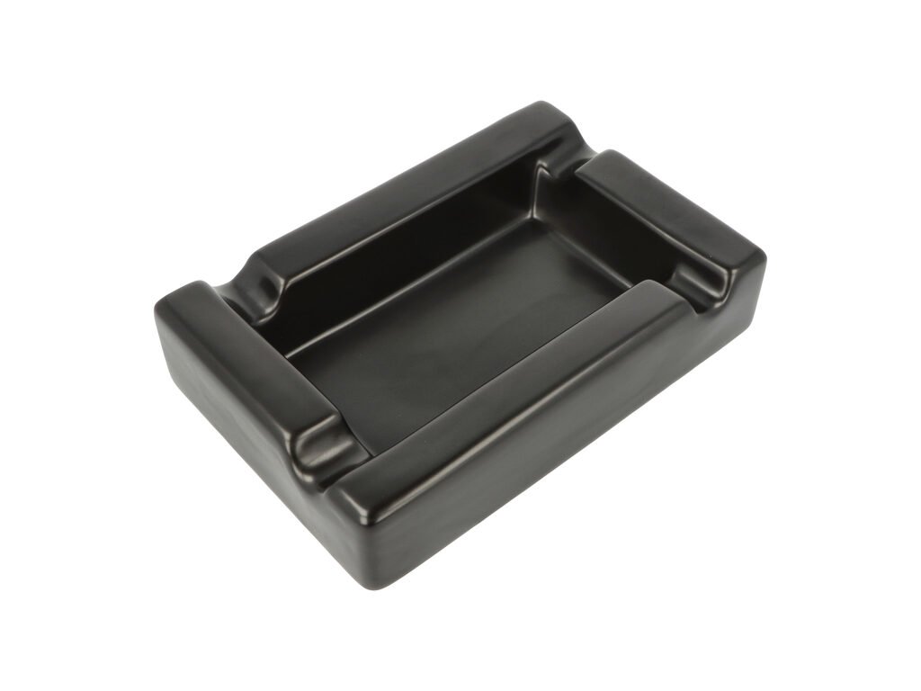 Doutníkový popelník na 4 doutníky. Hranatý keramický popelník obdélníkového tvaru je v černém matně glazurovaném provedení. Masivní popelník na doutníky je vybavený čtyřmi odklady pro doutník. Díky glazuře má popelník hladký povrch, který přispívá ke snadnějšímu čištění. Spodní část popelníku je vybavena plstěnými podložkami, které zabrání nejen pohybu, ale především poškrábání povrchu, na kterém je položený. Popelník je dodávaný v kartonové krabici.Rozměry popelníku (Š x H x V): 235 x 158 x 55 mm