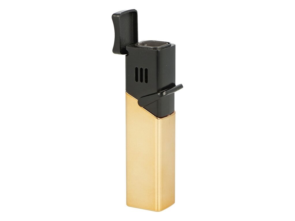Zapalovač na doutníky Eurojet Stick Cigar se stojánkem. Kovový tryskový zapalovač je ve zlatočerné barevné kombinaci. Díky čtyřem tryskám, které vyvinou silný plamen, je zapalovač je vhodný nejen k zapálení Vašich doutníků, ale také uhlíků do vodní dýmky, kuřiva do bongů, krbů nebo k přípravě pokrmů. Do praktické prohlubně v horní části můžete odložit svůj doutník. Okénkem na boku můžete sledovat hladinu plynu v zapalovači. Na spodní straně najdeme nastavení intenzity plamene a plnicí ventil. Zapalovač je dodávaný v dárkové krabičce.Rozměry zapalovače (Š x H x V): 2,3 x 2 x 9,6 cm