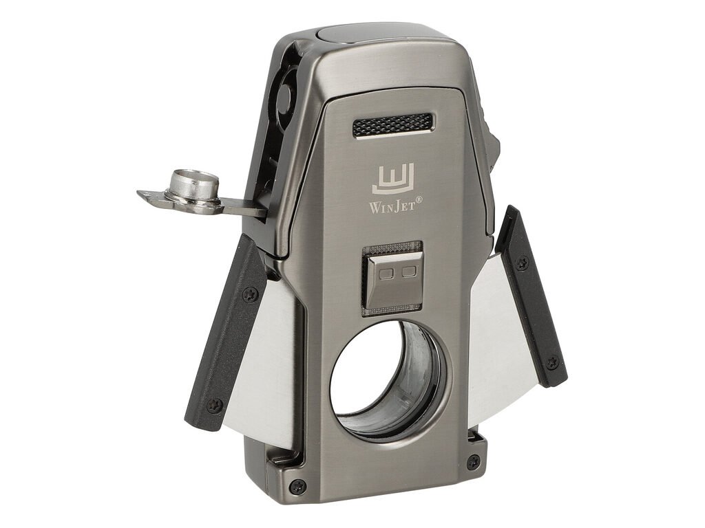 Zapalovač na doutníky Winjet Mega Cigar s ořezávačem, vyštípávačem a odkladem pro doutník. Masivní tryskový zapalovač v gunmetalovém provedení má pololesklý povrch. Praktická kombinace doutníkového zapalovače a ořezávače spolu s vyštípávačem se vždy kuřákovi doutníků hodí. Dvoubřitý ořezávač s ostrými břity zajistí rychlý a čistý ořez doutníku. O zapálení doutníku se postarají dvě trysky, které po stisknutí a odklopení krytu prostoru pro zapálení vyvinou silný plamen. Okénko na boční straně Vám umožní kontrolu hladiny plynu v zapalovači. Na levém boku najdeme výklopný vyštípávač. Pro odložení doutníku při kouření slouží "prohlubeň" s texturovaným povrchem na zadní straně zapalovače. Na spodní části je umístěný plnící ventil plynu a regulaci intenzity plamene. Zapalovač je dodávaný v dárkové krabičce.Max. průměr otvoru pro doutník: 22 mm