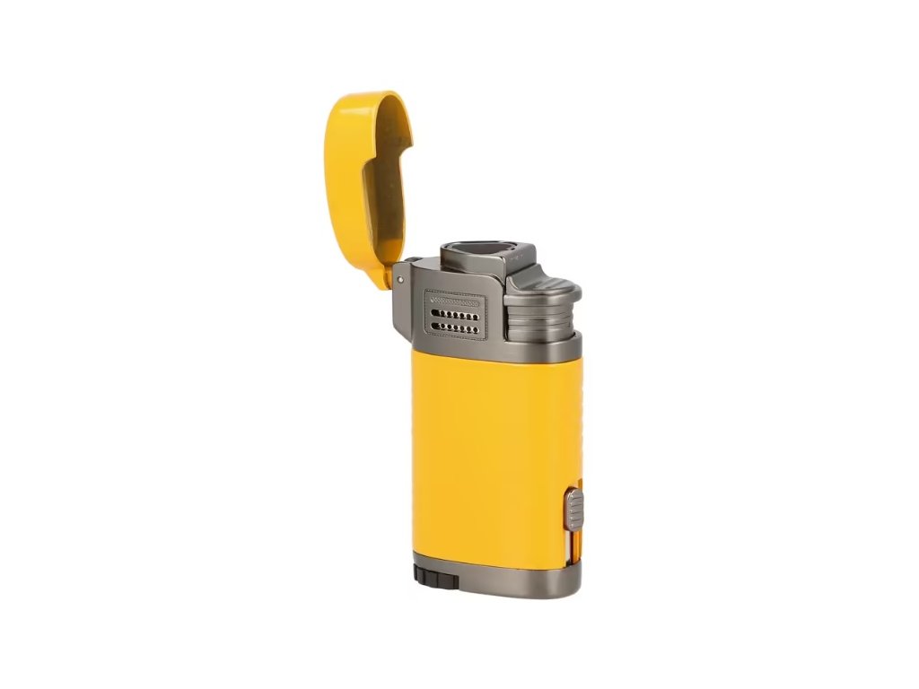 Zapalovač na doutníky Winjet Rysbol Cigar s integrovaným vyštípávačem a třemi tryskami. Kovový tryskový zapalovač má lesklý povrch ve žluté barvě. Po odklopení horního krytu a stisknutí tlačítka dojde k zapálení třech trysek, které vyvinou silný plamen pro zapálení Vašeho doutníku. Díky průhlednému okénku můžeme kontrolovat hladinu plynu v zapalovači. Na boku zapalovače najdeme výsuvný doutníkový vyštípávač. Prohlubně na krytu trysek lze využít jako stojánek na doutník. Ve spodní části je umístěna regulace plamene a plynový plnící ventil. Zapalovač je dodávaný v dárkové krabičce.; Průměr vyštípávače: 8 mm;Rozměry zapalovače (Š x H x V): 4 x 1,9 x 7,5 cmDoplňkové parametry