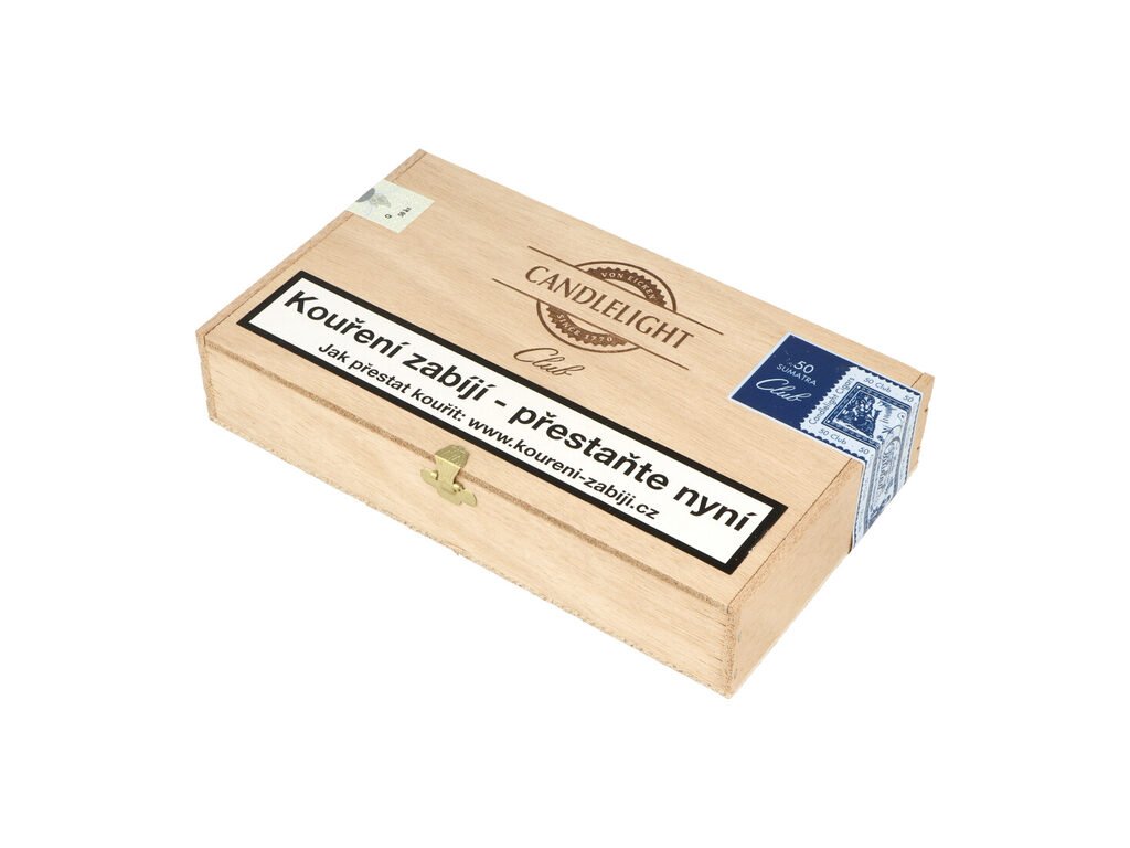 Suché doutníky Candlelight Club Sumatra v cedrovém boxu. Oblíbené strojově balené malé doutníčky jsou vyráběné v Německu. Při balení je použito tabáků ze Sumatry, Brazílie, Dominikánské republiky a Kuby. Jemně aromatické cigarillos jsou balené v celofánu a dodávané v cedrovém boxu po 50 ks. Prodávají se pouze po celém balení. Jelikož se jedná o doutníky typu suchého, není je nutné skladovat v humidoru.Délka: 100 mm