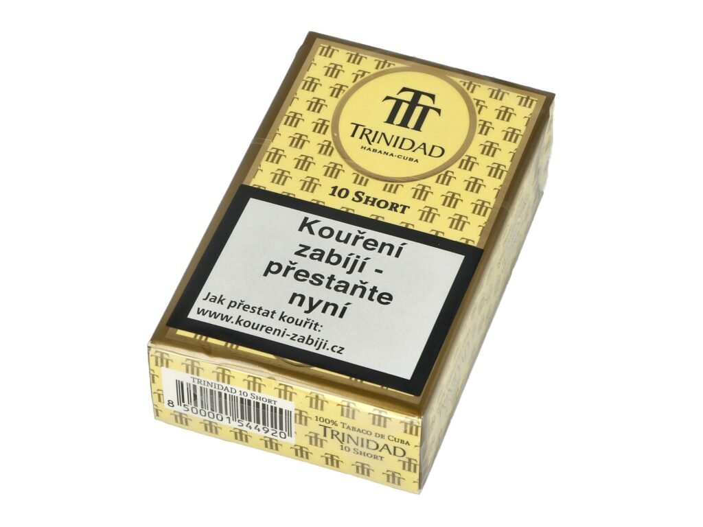 Kubánské doutníky Trinidad Short. Malé doutníčky s příjemnou chutí a vůní, které ocení nejen znalec doutníků, ale i příležitostný kuřák. Doutníky výborné kvality, které byly původně určené jako dary pro zahraniční návštěvy Fidela Castra. Doutníky Trinidad Short jsou strojově balené a precizně vyráběné z vybraných kvalitních tabáků ze známých plantáží oblasti Vuelta Abajo. Doutníky charakterizuje příjemná kořeněná a dřevitá chuť. Ačkoliv je Trinidad Short doutník suchý, pro lepší chuť jej doporučujeme zavlhčit. Doba hoření je cca 15 - 20 minut. Doutníky Trinidad Short jsou balené po 10 ks v celofánu a dodávané v originální krabičce Trinidad. Prodávají se pouze po celém balení. Délka: 83 mm Průměr: 10,6 mm Velikost prstýnku: 26 Tvar/velikost doutníku: Short/Puritos/Cigarillos Typ doutníku dle skladování: doutník suchý Původ doutníku: Kuba Krycí list: Kuba Natural (Vuelta Abajo) Vázací list: Kuba Natural (Vuelta Abajo) Náplň: Kuba Natural Síla tabáku: medium to fullDoplňkové parametry