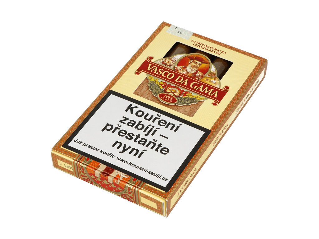 Doutníky Vasco da Gama No.2 Claro Sumatra. Suché doutníky jsou balené v celofánu po 5 doutnících v papírové krabičce. Prodej po celém boxu (25 ks doutníků). Cena uvedená za jednu krabičku.Délka: 152 mm