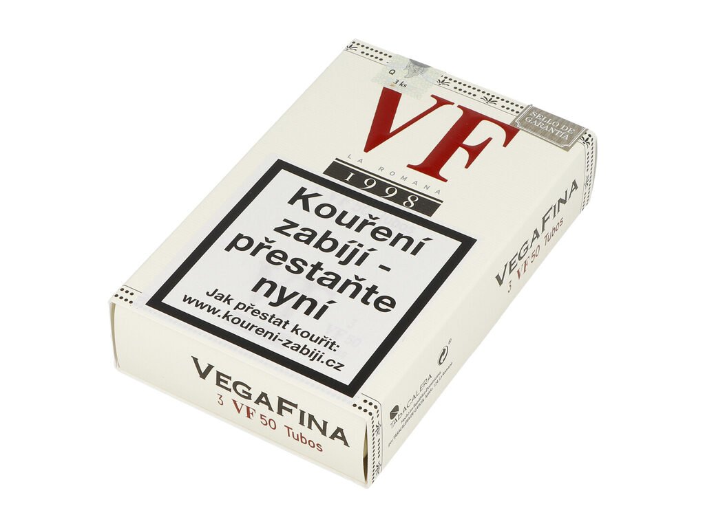 Vegafina 1998 VF 50 Tubos. Nová řada dominikánských doutníků představená výrobcem v roce 2019, které jsou vyrobené z tabáku tři roky stařeného ve walk-in humidorech v Dominikánské Republice. Jak již vidíme v názvu, tato řada byla vytvořená k oslavě roku 1998, kdy byla společnost Vegafina založená. Označení 50, 52, 54 je stejné jako u špičkové série Behike značky Cohiba. Vegafina patří pod dominikánskou část Habanos, proto bylo použito stejného označení. Toto číslo neznamená nic jiného než průměr doutníku, respektive jeho prstýnku. Ručně balené prémiové doutníky Vegafina jsou vyráběné z výběrových listů tabáku, které doutníkům dávají jedinečný charakter. Pro tyto středně silné doutníky je typická cedrová chuť spolu s chutí slanou, kterou doplňují sladké tóny vanilky, třtinového cukru a pepře. Doutníky Vegafina 1998 VF 50 jsou balené po 3 ks v originální hliníkové tubě a papírové krabičce. Prodávají se pouze po celém balení.Vegafina - to je kvalita, tradice, skvělý design a především precizní ruční výroba doutníků v Dominikánské republice.