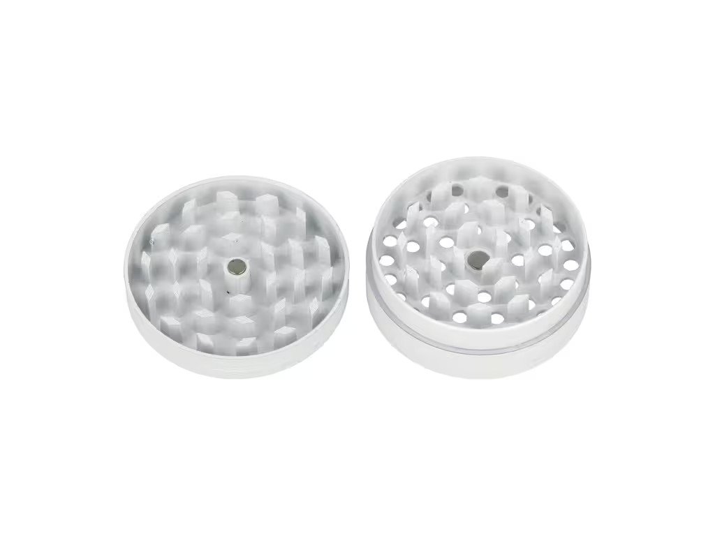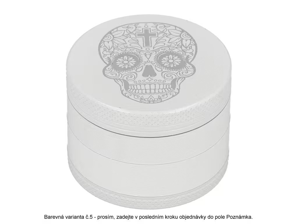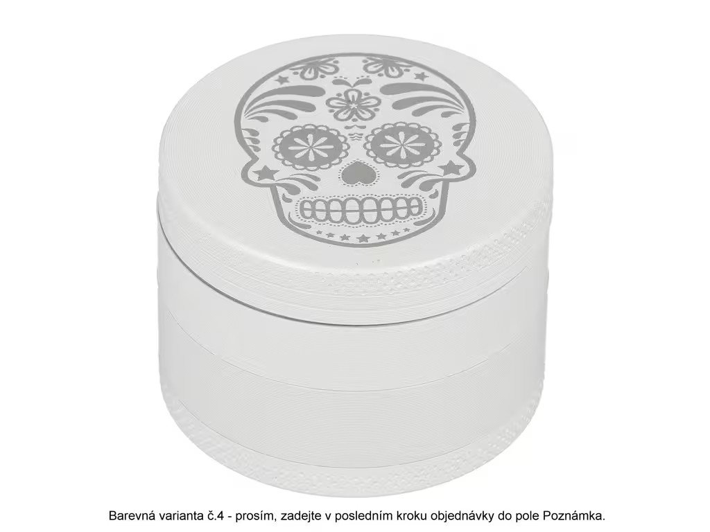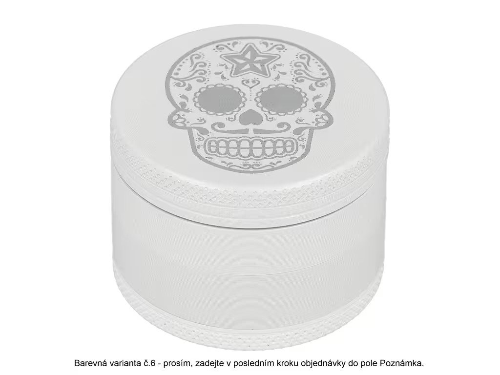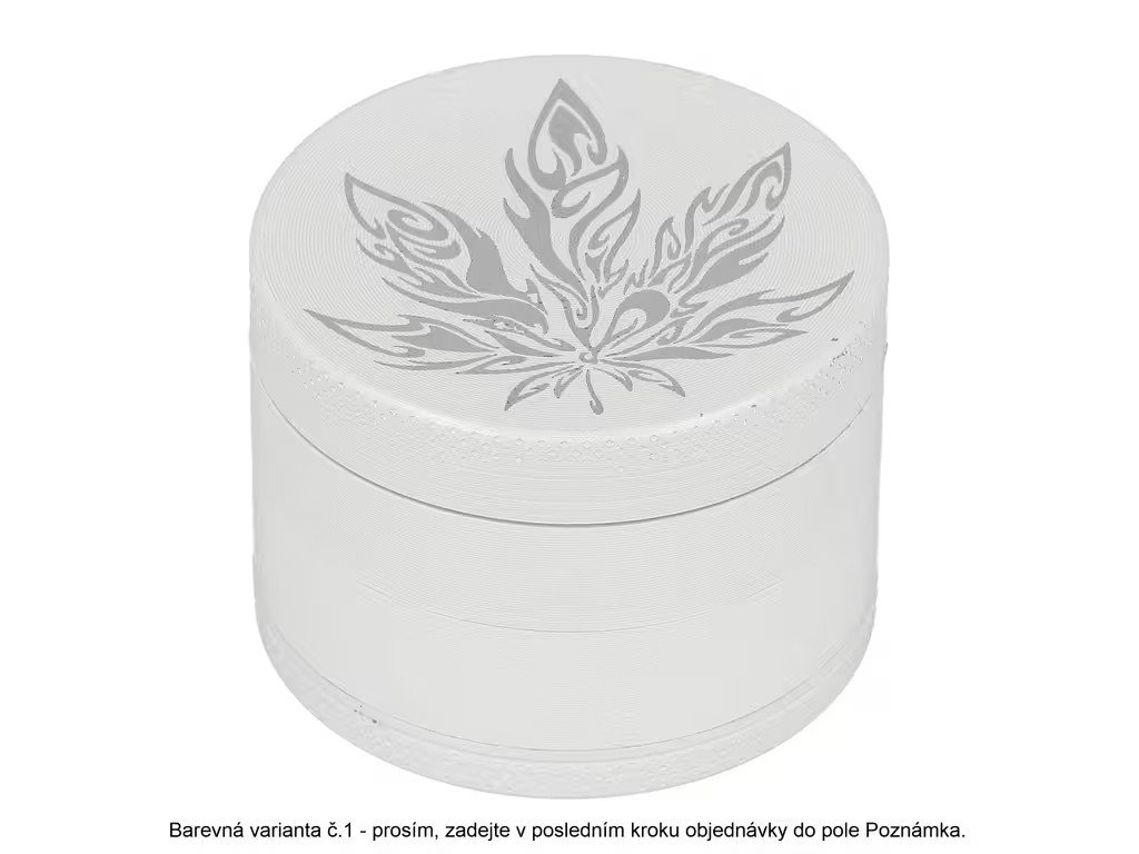 Kovový drtič bylin a tabáku Wildfire White&Silver. Menší čtyřdílná drtička konopí a jiných bylinek se závitem, sítkem a zásobníkem je v lesklém bílém provedení s jemně drážkovaným povrchem. Drtič je na horní straně víčka zdobený stříbrným motivem s měnícím efektem. Jednotlivé díly kovové drtičky na tabák jsou pevně spojené na závit, víčko je na magnet. Precizně broušené ostří nožů ve tvaru diamantu velmi jemně nadrtí vaši směs do požadované hrubosti. Kovový drtič je vyrobený CNC technologií z kvalitního hliníku. Cena uvedena za 1 ks. Před odesláním objednávky uveďte číslo barevného provedení do poznámky. Průměr drtiče: 49 mm; Výška drtiče: 37 mm.Doplňkové parametry
