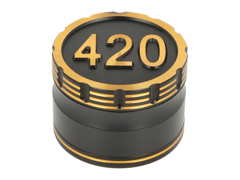 Kovový drtič tabáku a bylin 420. Čtyřdílná hliníková drtička konopí a jiných bylinek je vyrobena z eloxovaného hliníku CNC technologií. Hladký povrch drtičky v černé barvě je zdobený zlatými prvky, na víčku najdeme 3D nápis 420. Drtící část je pevně spojená na závit, víčko na magnet. Broušené ostří nožů ve tvaru diamantu velmi jemně nadrtí vaši směs do požadované hrubosti. Drtič je dodávaný v kartonové krabičce.Průměr drtiče: 62 mm