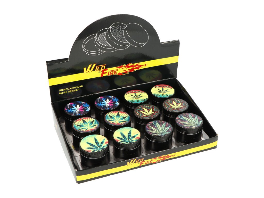 Kovový drtič bylin a tabáku Wildfire Mix Leaves. Menší čtyřdílná drtička konopí a jiných bylinek se závitem, sítkem a zásobníkem je v lesklém černém provedení. Díky jemně drážkovanému povrchu drtič neklouže při drcení v rukou. Horní strana víčka je zdobená barevným tištěným motivem s konopím. Jednotlivé díly kovové drtičky na tabák jsou pevně spojené na závit, víčko je na magnet. Precizně broušené ostří nožů ve tvaru diamantu velmi jemně nadrtí vaši směs do požadované hrubosti. Kovový drtič je vyrobený CNC technologií z kvalitního hliníku. Cena uvedena za 1 ks. Před odesláním objednávky uveďte číslo barevného provedení do poznámky.Průměr drtiče: 40 mm