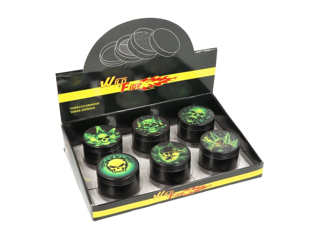Kovový drtič bylin a tabáku Wildfire Mix Skulls. Menší čtyřdílná drtička konopí a jiných bylinek se závitem, sítkem a zásobníkem je v lesklé černé barvě. Díky jemně drážkovanému povrchu se drtič dobře při drcení drží. Horní strana víčka je zdobená zeleno žlutým tištěným motivem s lebkou. Jednotlivé díly kovové drtičky na tabák jsou pevně spojené na závit, víčko je na magnet. Precizně broušené ostří nožů ve tvaru diamantu velmi jemně nadrtí vaši směs do požadované hrubosti. Kovový drtič je vyrobený CNC technologií z kvalitního hliníku. Cena uvedena za 1 ks. Před odesláním objednávky uveďte číslo barevného provedení do poznámky.Průměr drtiče: 49 mm