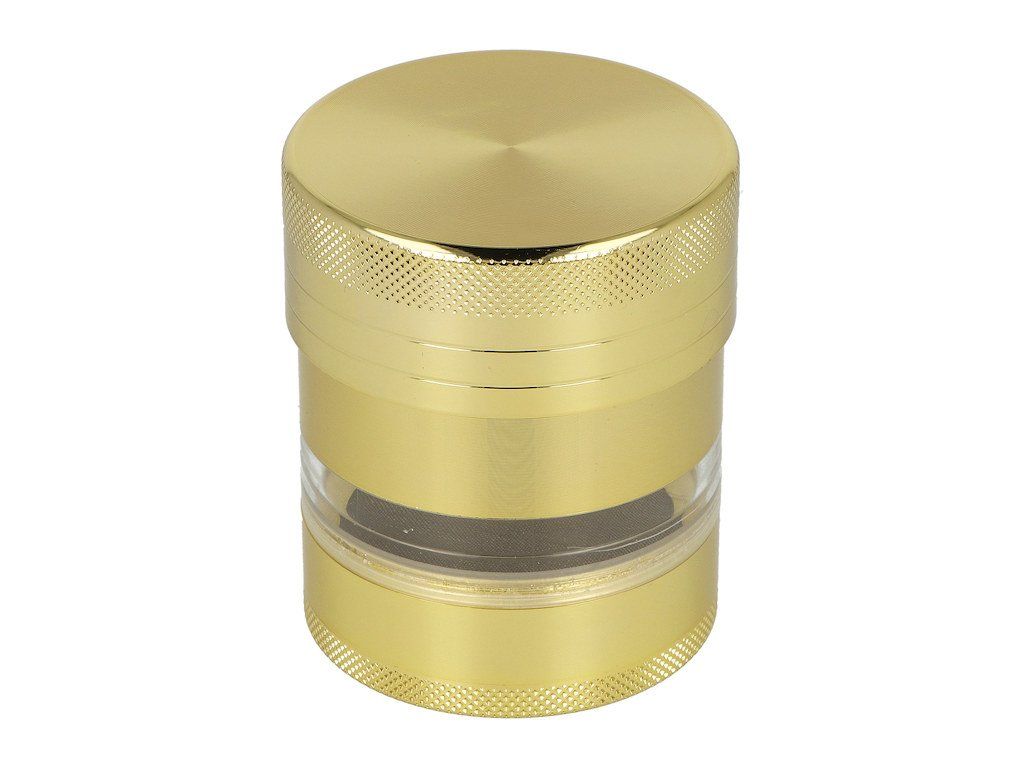 Kovový drtič tabáku a bylin Spiral. Velká čtyřdílná drtička konopí a jiných bylinek se závitem, sítkem a zásobníkem je ve zlatém provedení s hladkým povrchem. Drtič je precizně vyrobený CNC technologií. Transparentní okénko umožňují sledovat průběh drcení a též vidíme množství bylin. Drtící část se zásobníkem a sítkem je pevně spojená na závit, víčko na magnet. Speciální velký nůž ve tvaru "disku" s broušeným ostřím jemně nadrtí vaši směs do požadované hrubosti. Drtič je dodávaný v kartonové krabičce.Průměr drtiče: 66 mm