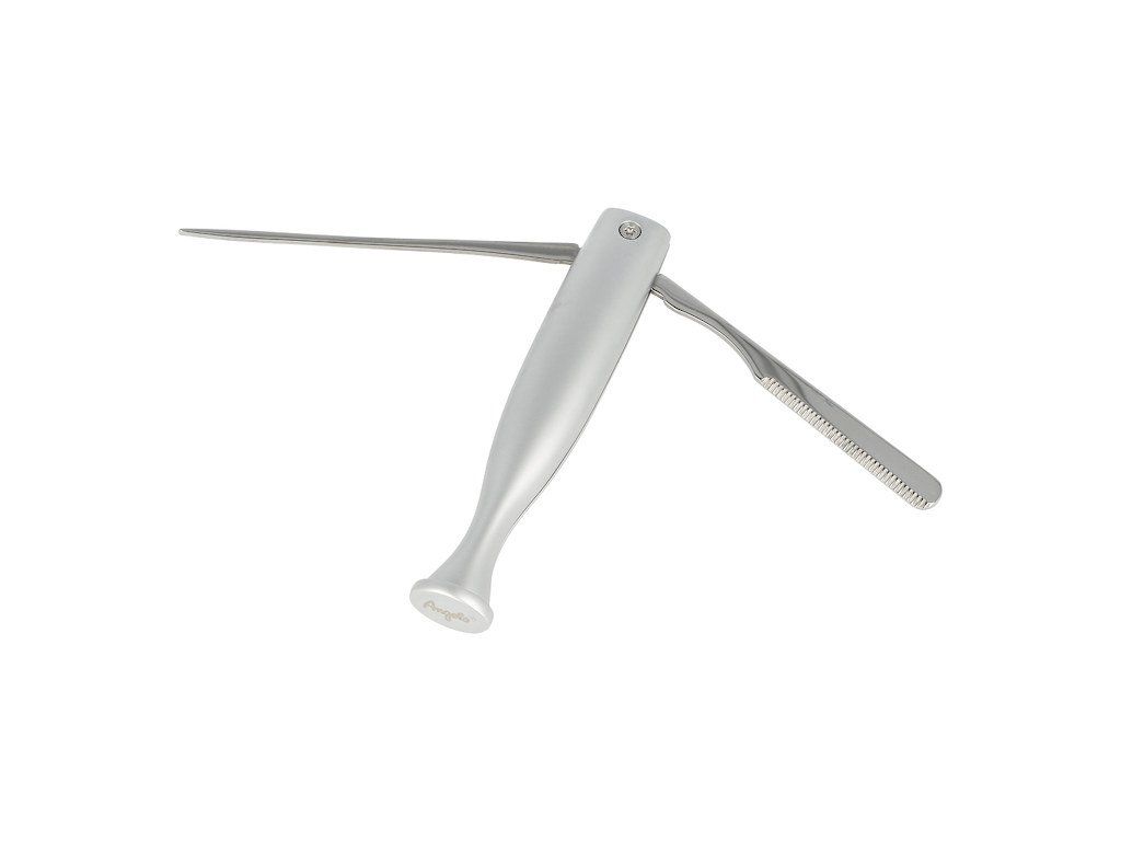 Kovové dusátko do dýmky. Elegantní třídílné dýmkové dusátko Angelo je má povrch ve stříbrné barvě v pololesklém provedení. Trn, dýmkový nůž a dusátko jsou vyrobené z leštěného nerezu. Praktická pomůcka, kterou kuřák dýmky každodenně potřebuje pro pěchování tabáku do dýmky, důkladné vyčištění a údržbu dýmky. Dodáváme v dárkové krabičce.Celkové rozměry (Š x H x V): 12 x 16 x 90 mm