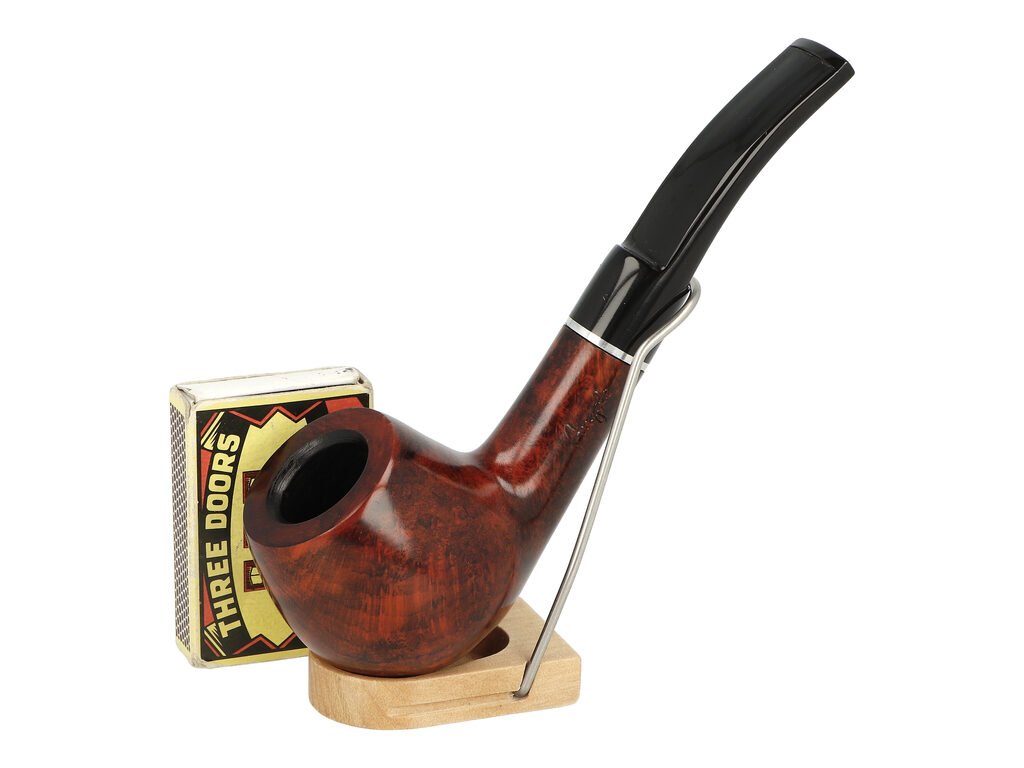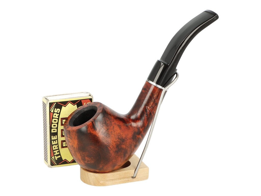 Zahnutá brierová dýmka Angelo s filtrem 9 mm. Dýmka vyrobená z brierového dřeva je ukončená akrylátovým náustkem. Dýmky Angelo jsou vhodnou volbou pro každodenní kouření díky skvělému poměru cena vs výkon. Dýmka je dodávaná bez filtru. Zobrazený stojánek není součástí balení dýmky.Briárová dýmka je ve tmavším hnědo oranžovém odstínu s kresbou. Na boku je dýmka zdobená rytým nápisem "Angelo". Hlava dýmky je lesklá, černý náustek taktéž. Filtr: 9 mm
