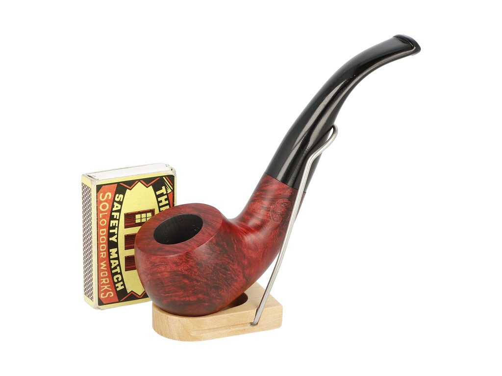 Kvalitní briárová dýmka s chladičem od známého výrobce BPK Proseč je ručně vyrobená z vybraných kusů briárového dřeva. V dýmce s chladičem se nepoužívá filtr. Kovový chladič vložený mezi troubelem a náustkem slouží jako kondenzační část a sráží se na něm močka. Díky tomu jazyk tolik nepálí, kouření je "chladnější" a tím pádem více příjemné. Chladič je součástí dýmky. Dýmka je dodávána v originální krabičce. Zobrazený stojánek není součástí balení dýmky.Zahnutá dýmka z briáru je ve tmavém červeném provedení s méně výraznou kresbou. Na boku dýmky najdeme rytý nápisem "BPK". Hlava dýmky je lesklá, černý ebonitový náustek také.