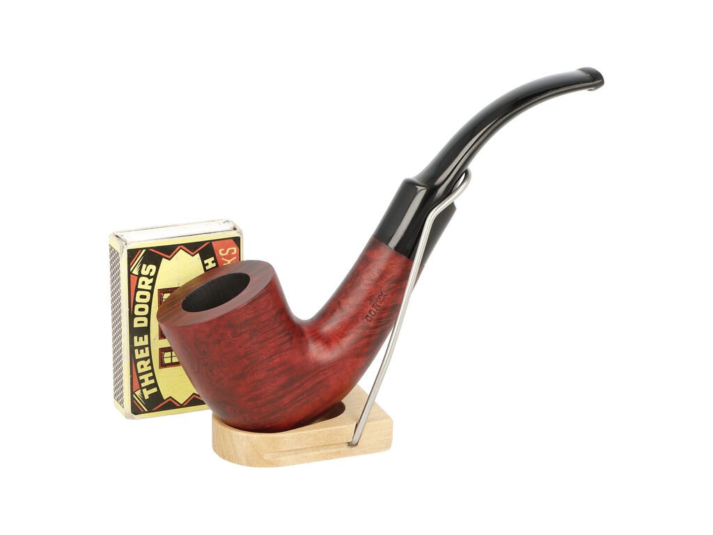 Kvalitní bruyerová dýmka s chladičem od známého výrobce BPK Proseč je precizně a ručně vyrobená. V dýmce s chladičem se nepoužívá filtr. Ochlazení kouře zajištuje kovový chladič, který je vložený mezi troubelem a náustkem. Chladič je součástí dýmky. Dýmka je dodávána v originální krabičce. Zobrazený stojánek není součástí balení dýmky.Zahnutá dýmka je ve tmavém hnědočerveném provedení s méně výraznou kresbou. Na boku je dýmka zdobená rytým nápisem "Dorex". Hlava dýmky je polomatná, černý ebonitový náustek lesklý.