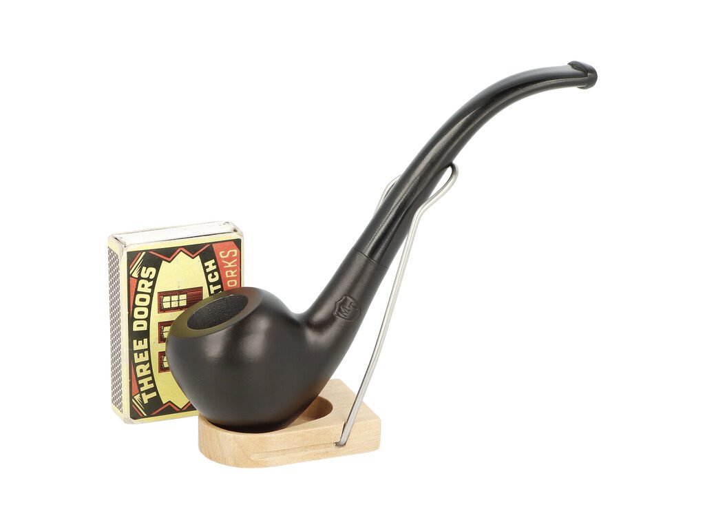 Kvalitní bruyerová dýmka s chladičem od známého výrobce BPK Proseč je precizně a ručně vyrobená. V dýmce s chladičem se nepoužívá filtr. Ochlazení kouře zajištuje kovový chladič, který je vložený mezi troubelem a náustkem. Chladič je součástí dýmky. Dýmka je dodávána v originální krabičce. Zobrazený stojánek není součástí balení dýmky.Zahnutá dýmka je v černé barvě bez kresby. Na boku je dýmka zdobená rytým nápisem "MT". Hlava dýmky je lesklá, černý akrylátový náustek také.