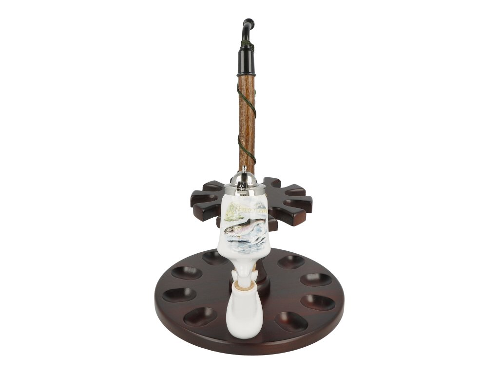 Keramická dýmka BPK Proseč. Porcelánka s rybářským motivem je ručně vyrobená. Keramická část dýmky má lesklý glazurovaný povrch. Na čelní straně hlavy dýmky najdeme barevný potisk se pstruhem. Porcelánová fajfka s dřevěným troubelem ukončená akrylátovým náustkem je zdobená omotanou šňůrkou ukončenou dřevěnými korálky. Hlavu dýmky uzavírá chromové víčko, které je zdobené jemným gravírováním. Keramická dýmka je dodávaná v dárkové krabičce. Zobrazený stojánek není součástí balení dýmky. Filtr/chladič: ne; Délka dýmky: 300 mm; Výška hlavy: 80 mm; Šířka hlavy: 47 mm; Průměr tabákové komory: 21 mm; Hloubka tabákové komory: 55 mm; Průměr krku: 16 mm.Doplňkové parametry