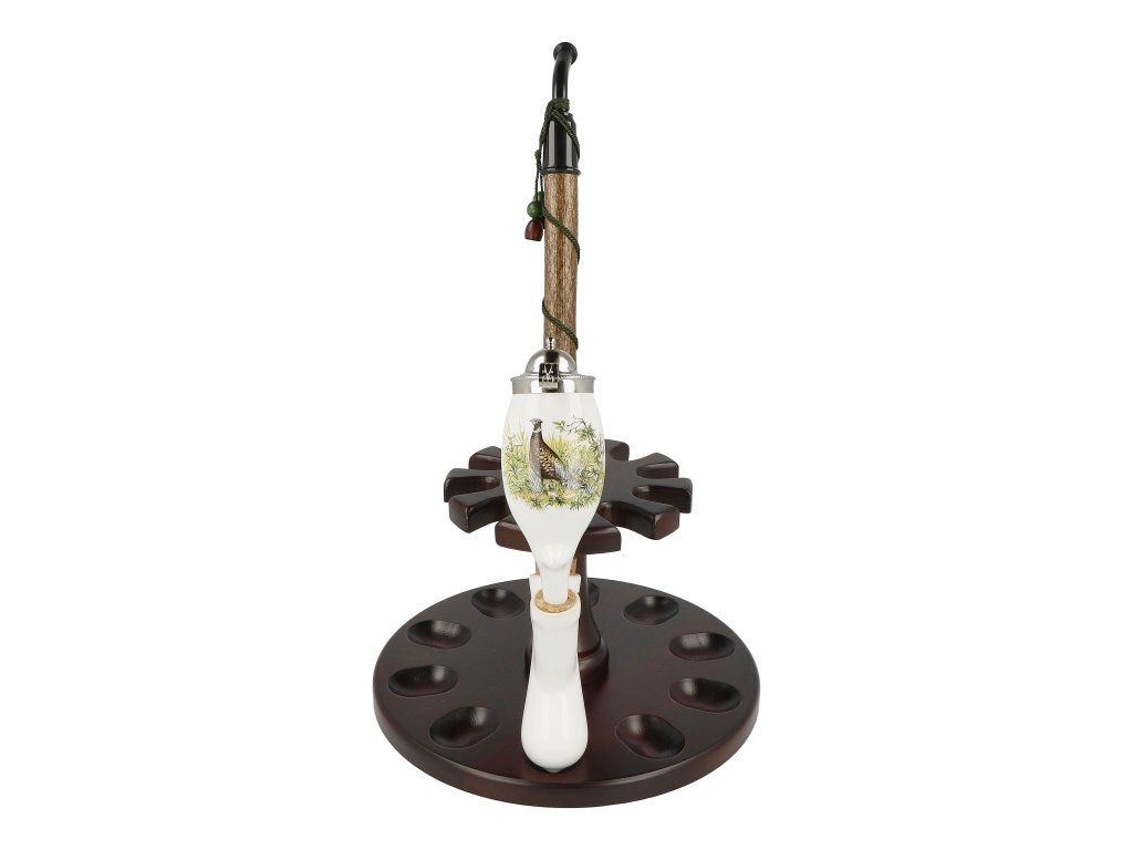 Keramická dýmka BPK Proseč. Porcelánka s loveckým motivem je ručně vyrobená. Keramická část dýmky má lesklý glazurovaný povrch. Na čelní straně hlavy dýmky najdeme barevný potisk s bažantem. Porcelánová fajfka s dřevěným troubelem ukončená akrylátovým náustkem je zdobená omotanou šňůrkou ukončenou dřevěnými korálky. Hlavu dýmky uzavírá chromové víčko, které je zdobené jemným gravírováním. Keramická dýmka je dodávaná v dárkové krabičce. Zobrazený stojánek není součástí balení dýmky.; Filtr/chladič: ne; Délka dýmky: 335 mm; Výška hlavy: 98 mm; Šířka hlavy: 43 mm; Průměr tabákové komory: 21 mm; Hloubka tabákové komory: 57 mm; Průměr krku: 16 mm; Hmotnost dýmky: 108 gDoplňkové parametry