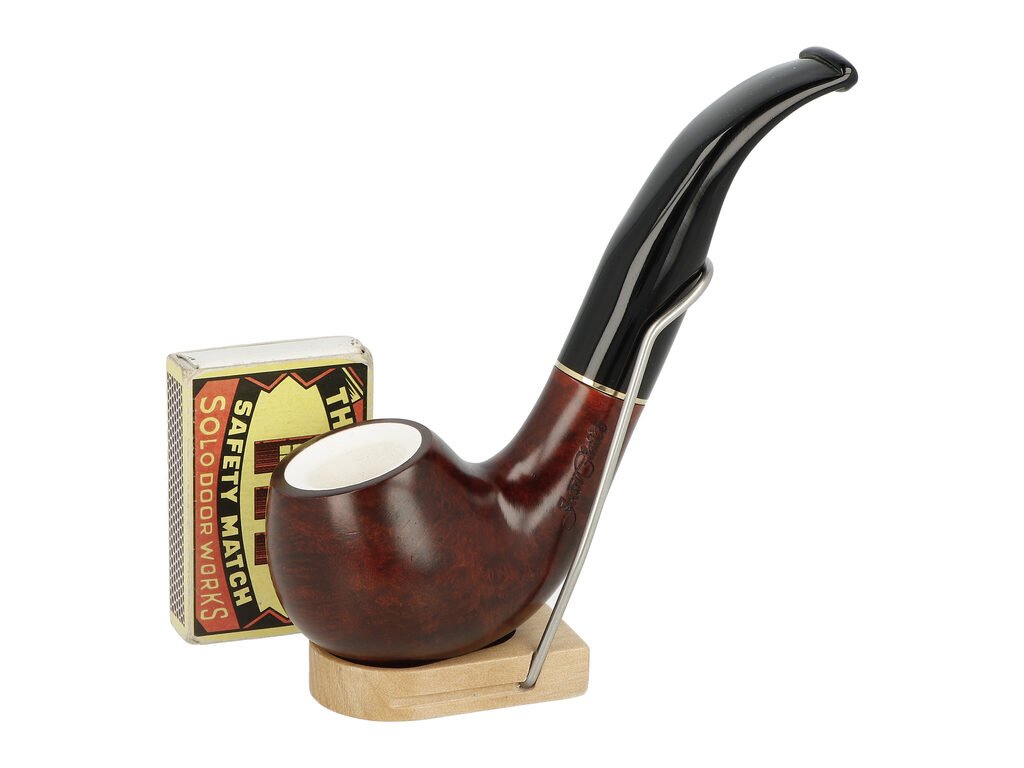 Dýmka s vložkou z mořské pěny a filtrem 9 mm. Briérová dýmka Jean Claude Meerschaum je precizně vyrobená z jakostního briérového dřeva. Meršánová vložka uvnitř hlavy zajišťuje dýmce větší odolnost vůči žáru a díky tomu dehtový roztok (odpadní produkt vznikající při hoření tabáku) v dýmce rychleji vysychá. Mezi troubelem a náustkem je vložený okrasný kovový kroužek. Součástí dodávky dýmky není filtr. Dýmka je dodávaná v látkovém sáčku. Vyobrazený stojánek není součástí balení dýmky.Zahnutá dýmka je ve tmavším hnědém hladkém provedení s kresbou. Na boku je dýmka zdobená rytým nápisem "Jean Claude". Hlava dýmky je lesklá stejně jako černý akrylátový náustek.