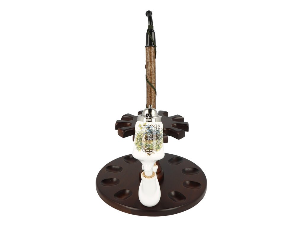 Keramická dýmka BPK Proseč. Porcelánka s loveckým motivem je ručně vyrobená. Keramická část dýmky má lesklý glazurovaný povrch. Na čelní straně hlavy dýmky najdeme barevný potisk se sedící kachnou. Porcelánová fajfka s dřevěným troubelem ukončená akrylátovým náustkem je zdobená omotanou šňůrkou ukončenou dřevěnými korálky. Hlavu dýmky uzavírá chromové víčko, které je zdobené jemným gravírováním. Keramická dýmka je dodávaná v dárkové krabičce. Zobrazený stojánek není součástí balení dýmky.Filtr/chladič: ne