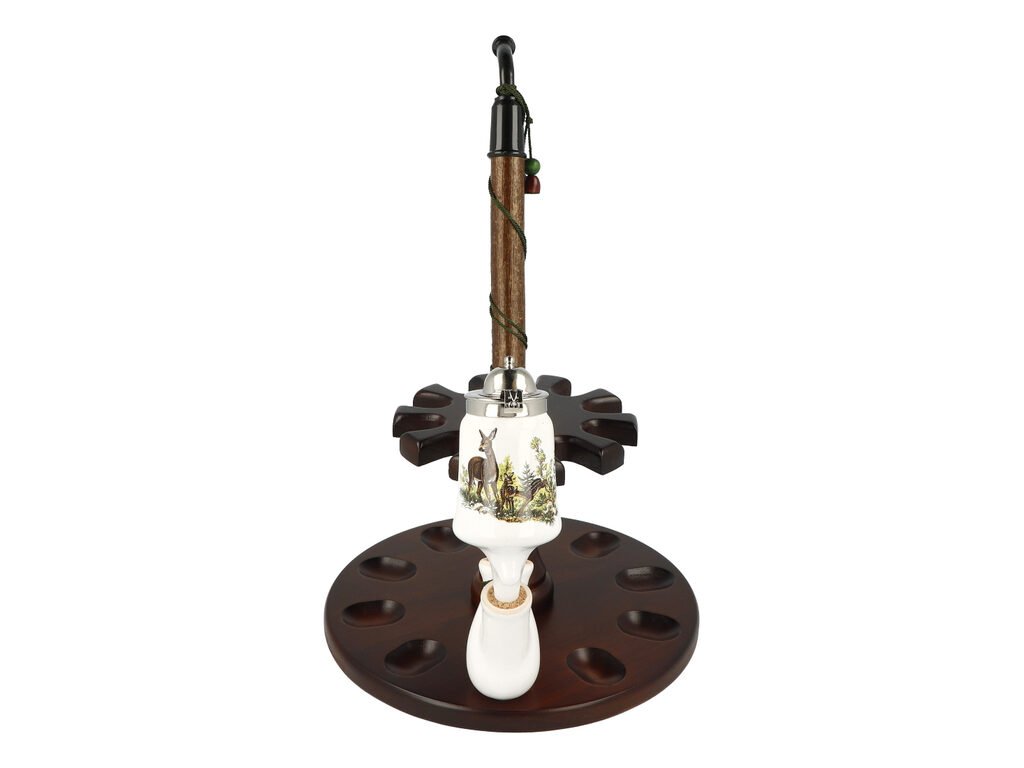 Keramická dýmka BPK Proseč. Porcelánka s loveckým motivem je ručně vyrobená. Keramická část dýmky má lesklý glazurovaný povrch. Na čelní straně hlavy dýmky najdeme barevný potisk se srnkou a mláďaty. Porcelánová fajfka s dřevěným troubelem ukončená akrylátovým náustkem je zdobená omotanou šňůrkou ukončenou dřevěnými korálky. Hlavu dýmky uzavírá chromové víčko, které je zdobené jemným gravírováním. Keramická dýmka je dodávaná v dárkové krabičce. Zobrazený stojánek není součástí balení dýmky.Filtr/chladič: ne