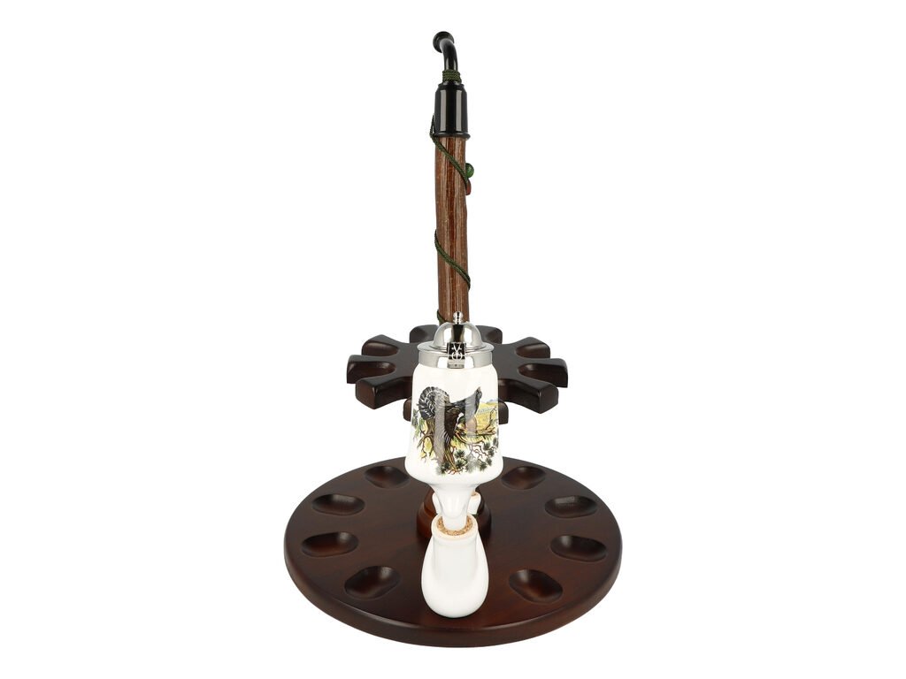 Keramická dýmka BPK Proseč. Porcelánka s loveckým motivem je ručně vyrobená. Keramická část dýmky má lesklý glazurovaný povrch. Na čelní straně hlavy dýmky najdeme barevný potisk s tetřevem. Porcelánová fajfka s dřevěným troubelem ukončená akrylátovým náustkem je zdobená omotanou šňůrkou ukončenou dřevěnými korálky. Hlavu dýmky uzavírá chromové víčko, které je zdobené jemným gravírováním. Keramická dýmka je dodávaná v dárkové krabičce. Zobrazený stojánek není součástí balení dýmky.Filtr/chladič: ne