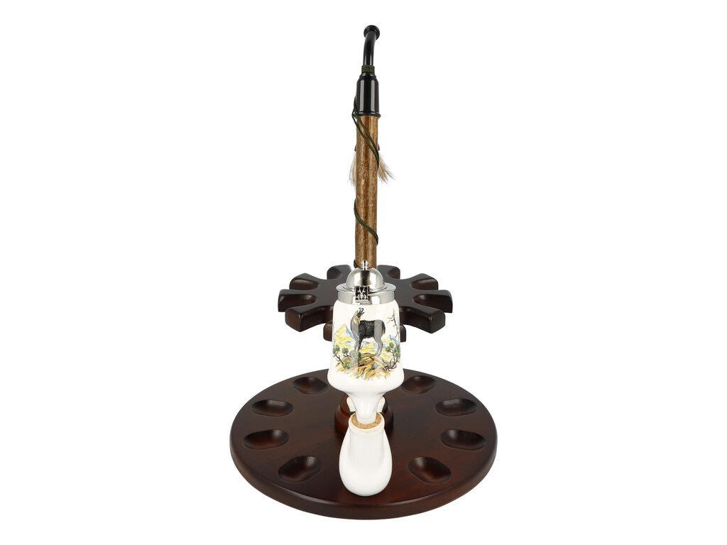 Keramická dýmka BPK Proseč. Porcelánka s loveckým motivem je ručně vyrobená. Keramická část dýmky má lesklý glazurovaný povrch. Na čelní straně hlavy dýmky najdeme barevný potisk s kamzíkem. Porcelánová fajfka s dřevěným troubelem ukončená akrylátovým náustkem je zdobená omotanou šňůrkou ukončenou dřevěnými korálky. Hlavu dýmky uzavírá chromové víčko, které je zdobené jemným gravírováním. Keramická dýmka je dodávaná v dárkové krabičce. Zobrazený stojánek není součástí balení dýmky.Filtr/chladič: ne