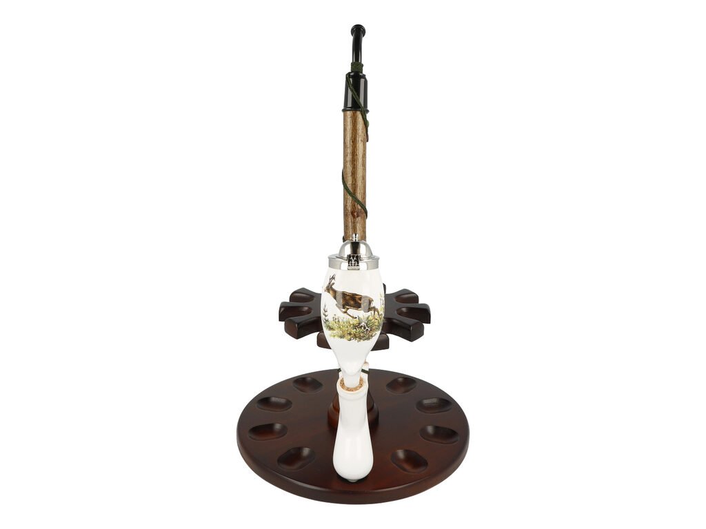Keramická dýmka BPK Proseč. Porcelánka s loveckým motivem je ručně vyrobená. Keramická část dýmky má lesklý glazurovaný povrch. Na čelní straně hlavy dýmky najdeme barevný potisk se skákajícím srncem. Porcelánová fajfka s dřevěným troubelem ukončená akrylátovým náustkem je zdobená omotanou šňůrkou ukončenou dřevěnými korálky. Hlavu dýmky uzavírá chromové víčko, které je zdobené jemným gravírováním. Keramická dýmka je dodávaná v dárkové krabičce. Zobrazený stojánek není součástí balení dýmky.Filtr/chladič: ne