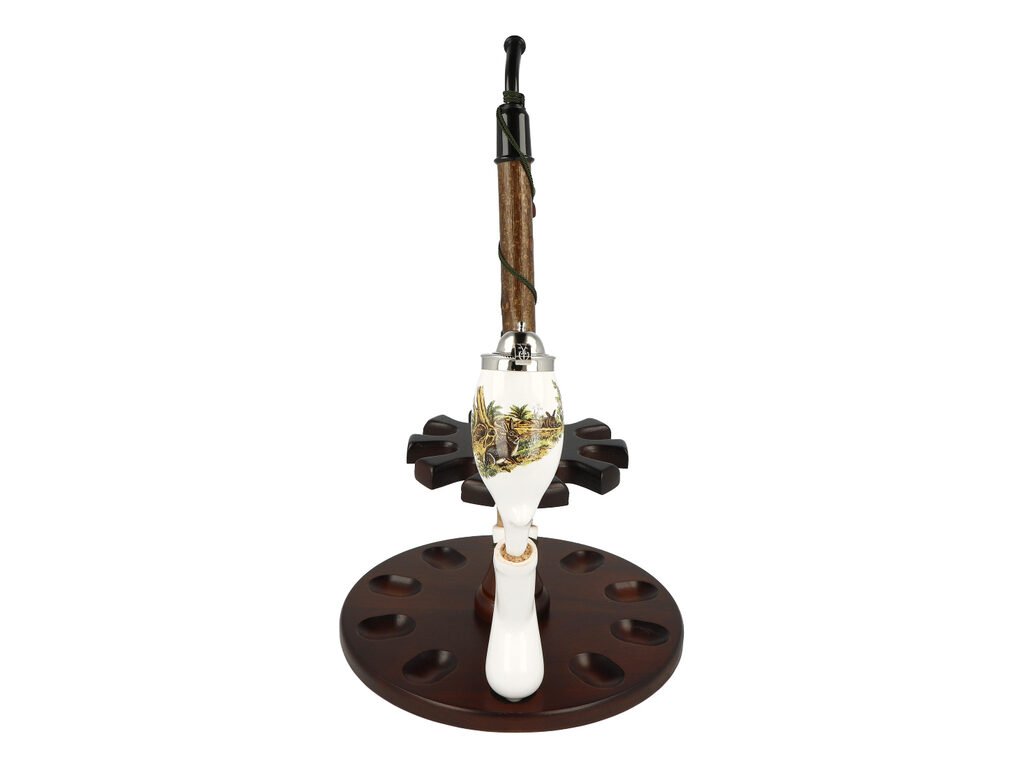 Keramická dýmka BPK Proseč. Porcelánka s loveckým motivem je ručně vyrobená. Keramická část dýmky má lesklý glazurovaný povrch. Na čelní straně hlavy dýmky najdeme barevný potisk se zajíci. Porcelánová fajfka s dřevěným troubelem ukončená akrylátovým náustkem je zdobená omotanou šňůrkou ukončenou dřevěnými korálky. Hlavu dýmky uzavírá chromové víčko, které je zdobené jemným gravírováním. Keramická dýmka je dodávaná v dárkové krabičce. Zobrazený stojánek není součástí balení dýmky.Filtr/chladič: ne