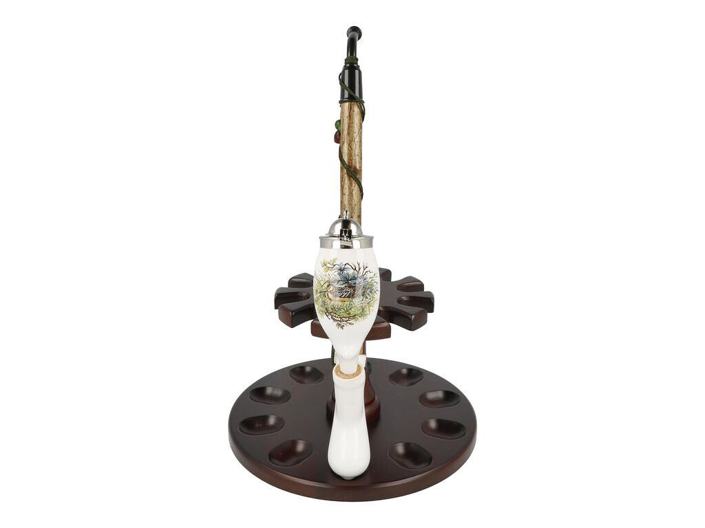 Keramická dýmka BPK Proseč. Porcelánka s loveckým motivem je ručně vyrobená. Keramická část dýmky má lesklý glazurovaný povrch. Na čelní straně hlavy dýmky najdeme barevný potisk s kachnou. Porcelánová fajfka s dřevěným troubelem ukončená akrylátovým náustkem je zdobená omotanou šňůrkou ukončenou dřevěnými korálky. Hlavu dýmky uzavírá chromové víčko, které je zdobené jemným gravírováním. Keramická dýmka je dodávaná v dárkové krabičce. Zobrazený stojánek není součástí balení dýmky.Filtr/chladič: ne