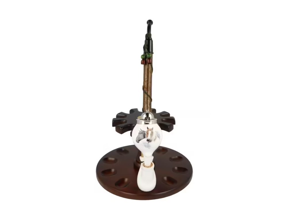 Keramická dýmka BPK Proseč. Porcelánka s koňským motivem je ručně vyrobená. Keramická část dýmky má lesklý glazurovaný povrch. Na čelní straně hlavy dýmky najdeme barevný potisk s divokými koňmi. Porcelánová fajfka s dřevěným troubelem ukončená akrylátovým náustkem je zdobená omotanou šňůrkou ukončenou dřevěnými korálky. Hlavu dýmky uzavírá chromové víčko, které je zdobené jemným gravírováním. Keramická dýmka je dodávaná v dárkové krabičce. Zobrazený stojánek není součástí balení dýmky.; Filtr/chladič: ne; Délka dýmky: 310 mm; Výška hlavy: 80 mm; Šířka hlavy: 51 mm; Průměr tabákové komory: 21 mm; Hloubka tabákové komory: 54 mm; Průměr krku: 16 mm; Hmotnost dýmky: 102 gDoplňkové parametry