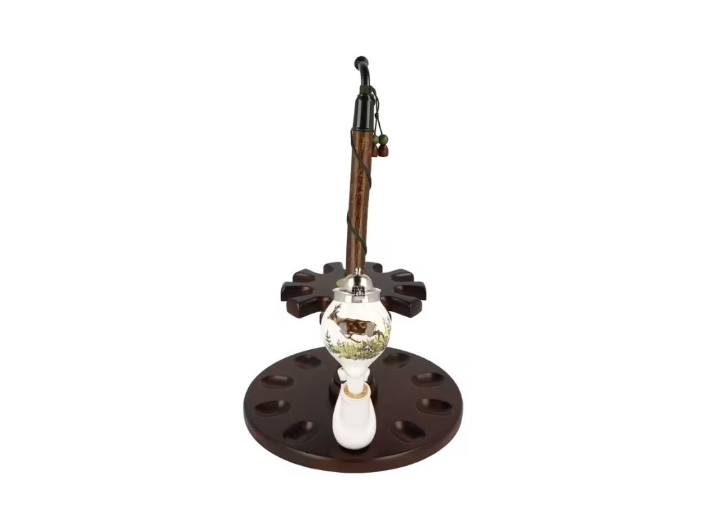 Keramická dýmka BPK Proseč. Porcelánka s loveckým motivem je ručně vyrobená. Keramická část dýmky má lesklý glazurovaný povrch. Na čelní straně hlavy dýmky najdeme barevný potisk se srncem ve skoku. Porcelánová fajfka s dřevěným troubelem ukončená akrylátovým náustkem je zdobená omotanou šňůrkou ukončenou dřevěnými korálky. Hlavu dýmky uzavírá chromové víčko, které je zdobené jemným gravírováním. Keramická dýmka je dodávaná v dárkové krabičce. Zobrazený stojánek není součástí balení dýmky.Doplňkové parametry