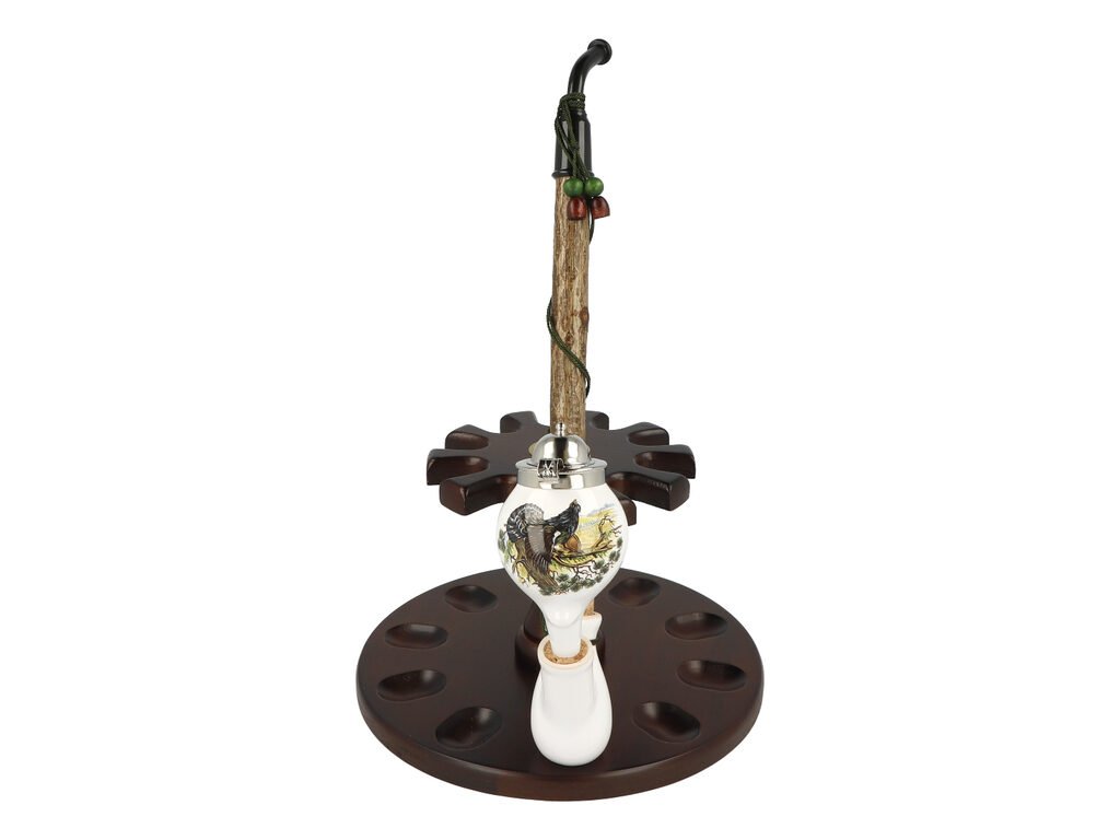 Keramická dýmka BPK Proseč. Porcelánka s loveckým motivem je ručně vyrobená. Keramická část dýmky má lesklý glazurovaný povrch. Na čelní straně hlavy dýmky najdeme barevný potisk s tetřevem. Porcelánová fajfka s dřevěným troubelem ukončená akrylátovým náustkem je zdobená omotanou šňůrkou ukončenou dřevěnými korálky. Hlavu dýmky uzavírá chromové víčko, které je zdobené jemným gravírováním. Keramická dýmka je dodávaná v dárkové krabičce. Zobrazený stojánek není součástí balení dýmky.Filtr/chladič: ne