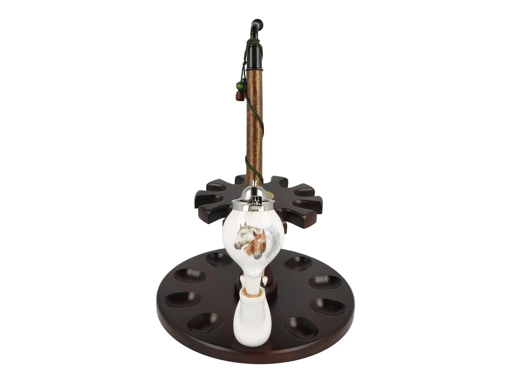 Keramická dýmka BPK Proseč. Porcelánka s koňským motivem je ručně vyrobená. Keramická část dýmky má lesklý glazurovaný povrch. Na čelní straně hlavy dýmky najdeme barevný potisk s koňmi. Porcelánová fajfka s dřevěným troubelem ukončená akrylátovým náustkem je zdobená omotanou šňůrkou ukončenou dřevěnými korálky. Hlavu dýmky uzavírá chromové víčko, které je zdobené jemným gravírováním. Keramická dýmka je dodávaná v dárkové krabičce. Zobrazený stojánek není součástí balení dýmky.Filtr/chladič: ne
