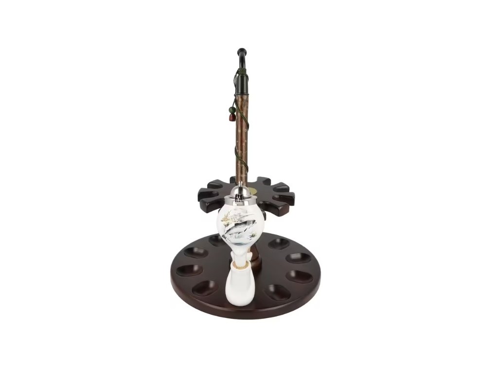 Keramická dýmka BPK Proseč. Porcelánka s rybářským motivem je ručně vyrobená. Keramická část dýmky má lesklý glazurovaný povrch. Na čelní straně hlavy dýmky najdeme barevný potisk se skákajícím pstruhem. Porcelánová fajfka s dřevěným troubelem ukončená akrylátovým náustkem je zdobená omotanou šňůrkou ukončenou dřevěnými korálky. Hlavu dýmky uzavírá chromové víčko, které je zdobené jemným gravírováním. Keramická dýmka je dodávaná v dárkové krabičce. Zobrazený stojánek není součástí balení dýmky.; Filtr/chladič: ne; Délka dýmky: 310 mm Výška hlavy: 80 mm; Šířka hlavy: 51 mm; Průměr tabákové komory: 21 mm; Hloubka tabákové komory: 54 mm; Průměr krku: 16 mm Hmotnost dýmky: 97 gDoplňkové parametry