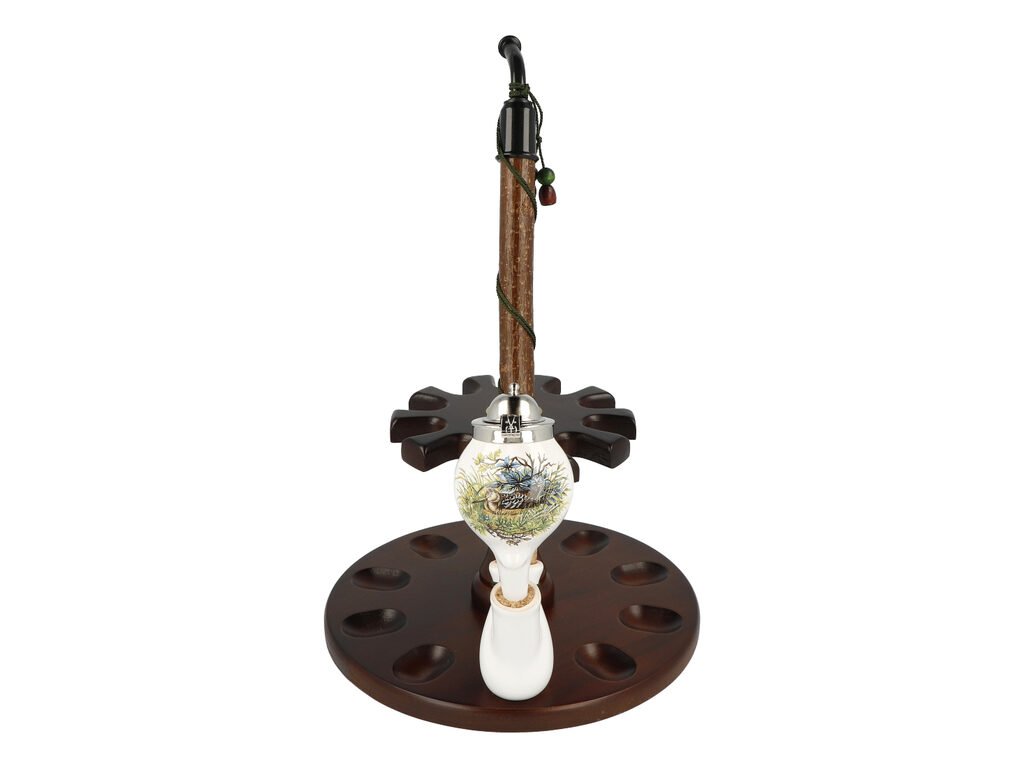 Keramická dýmka BPK Proseč. Porcelánka s loveckým motivem je ručně vyrobená. Keramická část dýmky má lesklý glazurovaný povrch. Na čelní straně hlavy dýmky najdeme barevný potisk s kachnou v trávě. Porcelánová fajfka s dřevěným troubelem ukončená akrylátovým náustkem je zdobená omotanou šňůrkou ukončenou dřevěnými korálky. Hlavu dýmky uzavírá chromové víčko, které je zdobené jemným gravírováním. Keramická dýmka je dodávaná v dárkové krabičce. Zobrazený stojánek není součástí balení dýmky.Filtr/chladič: ne