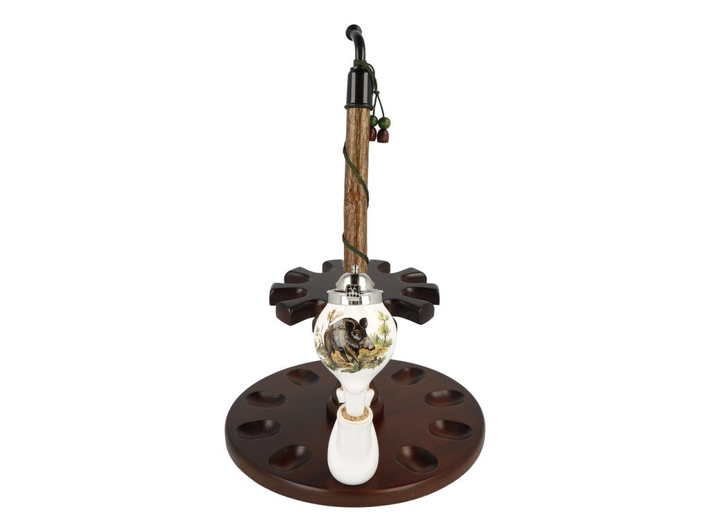 Keramická dýmka BPK Proseč. Porcelánka s loveckým motivem je ručně vyrobená. Keramická část dýmky má lesklý glazurovaný povrch. Na čelní straně hlavy dýmky najdeme barevný potisk s divočákem. Porcelánová fajfka s dřevěným troubelem ukončená akrylátovým náustkem je zdobená omotanou šňůrkou ukončenou dřevěnými korálky. Hlavu dýmky uzavírá chromové víčko, které je zdobené jemným gravírováním. Keramická dýmka je dodávaná v dárkové krabičce. Zobrazený stojánek není součástí balení dýmky.Filtr/chladič: ne